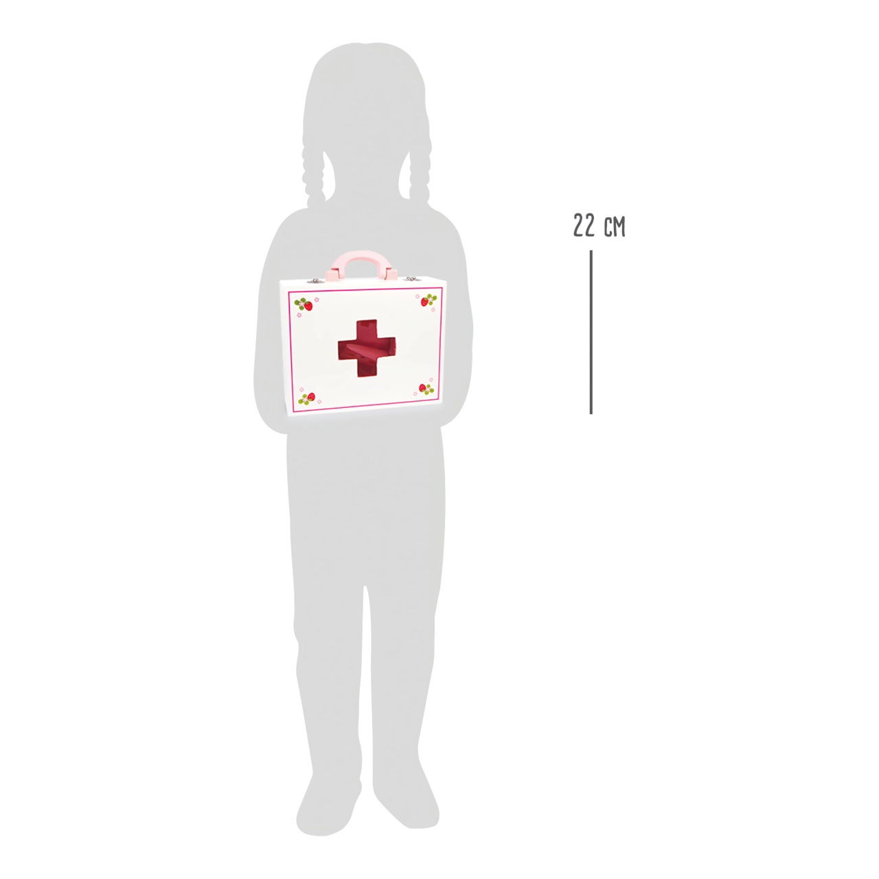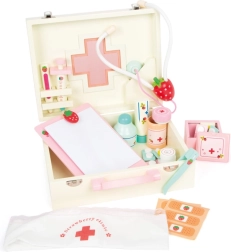 Žavus gydytojo lagaminėlis mažiesiems gydytojams pateikiamas su 24 mediniais priedais, įskaitant stetoskopą, termometrą ir švirkštą. Žaidimų rinkinys su braškių motyvu skatina kūrybiškumą, bendravimą ir vaizduotės lavinimą. Patogus lagaminėlis su rankena padeda viską laikyti tvarkingai, lengvai neštis ir susidėti.