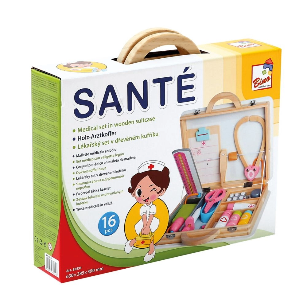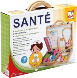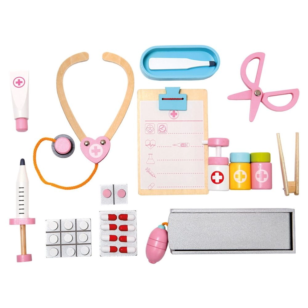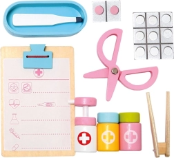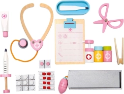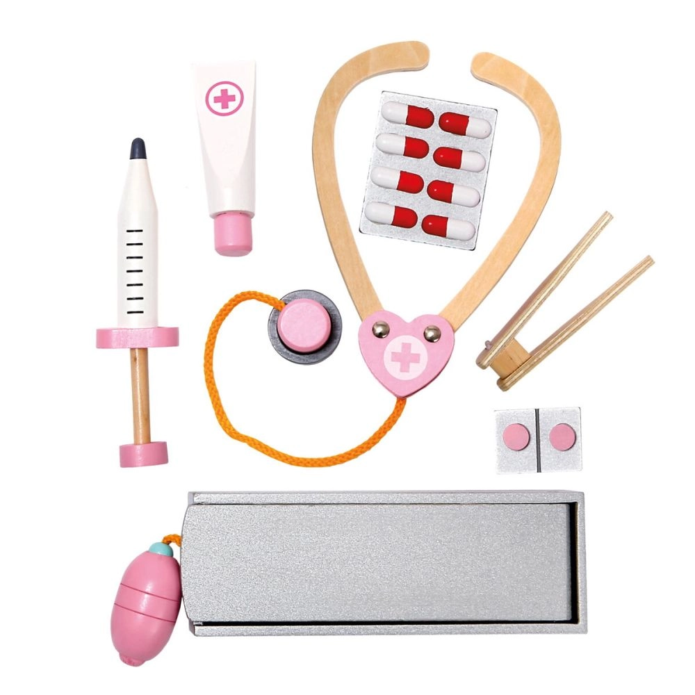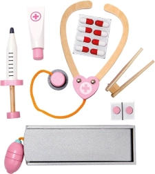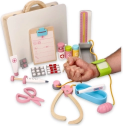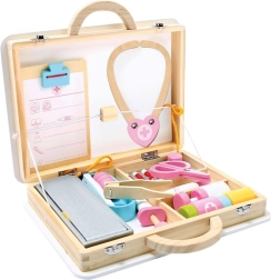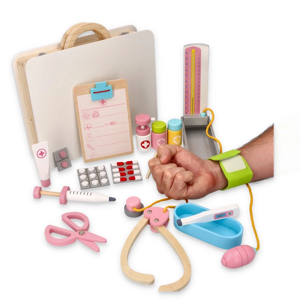 Vaikiškas medinis gydytojo rinkinys patogiame lagaminėlyje turi 16 dalių, o tėvai gali stebėti, kaip vaikai lavina savo vaizduotę ir smulkiąją motoriką žaisdami gydytojus. Tinka mokomajam žaidimui ir padeda mažinti baimę prieš vizitus pas gydytoją.