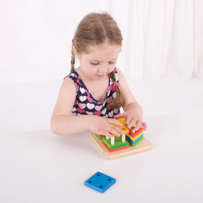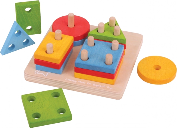 Ši medinė dėlionė su pagrindu ir kaiščiais bei ryškiomis geometrinėmis formomis (apskritimai, kvadratai, trikampiai, stačiakampiai) suteikia vaikams pažinimo ir mokymosi džiaugsmą. Dėliodami atskiras detales vaikai lavina suėmimą, akių–rankų koordinaciją ir loginį mąstymą, kartu natūraliai mokosi skirti spalvas ir formas bei pirmųjų skaičiavimo įgūdžių.