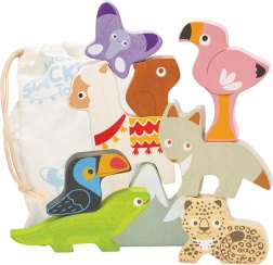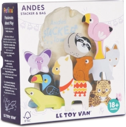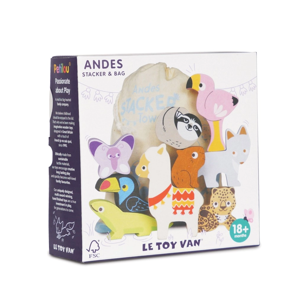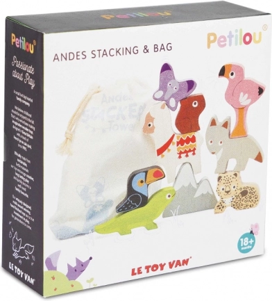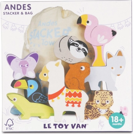 Šis Andų rietuvės bokštas atneša kalnų nuotykius tiesiai į vaikų kambarį. Rinkinyje – tvirti mediniai gyvūnų figurėliai (pvz., lama, flamingas, tūkanas, driežas, drugelis, tinginys) ir kalno detalė, kuriuos galima statyti, balansuoti ir derinti į smagias kompozicijas.