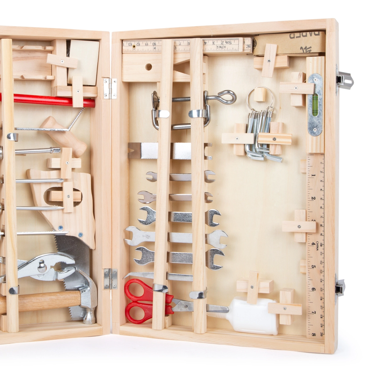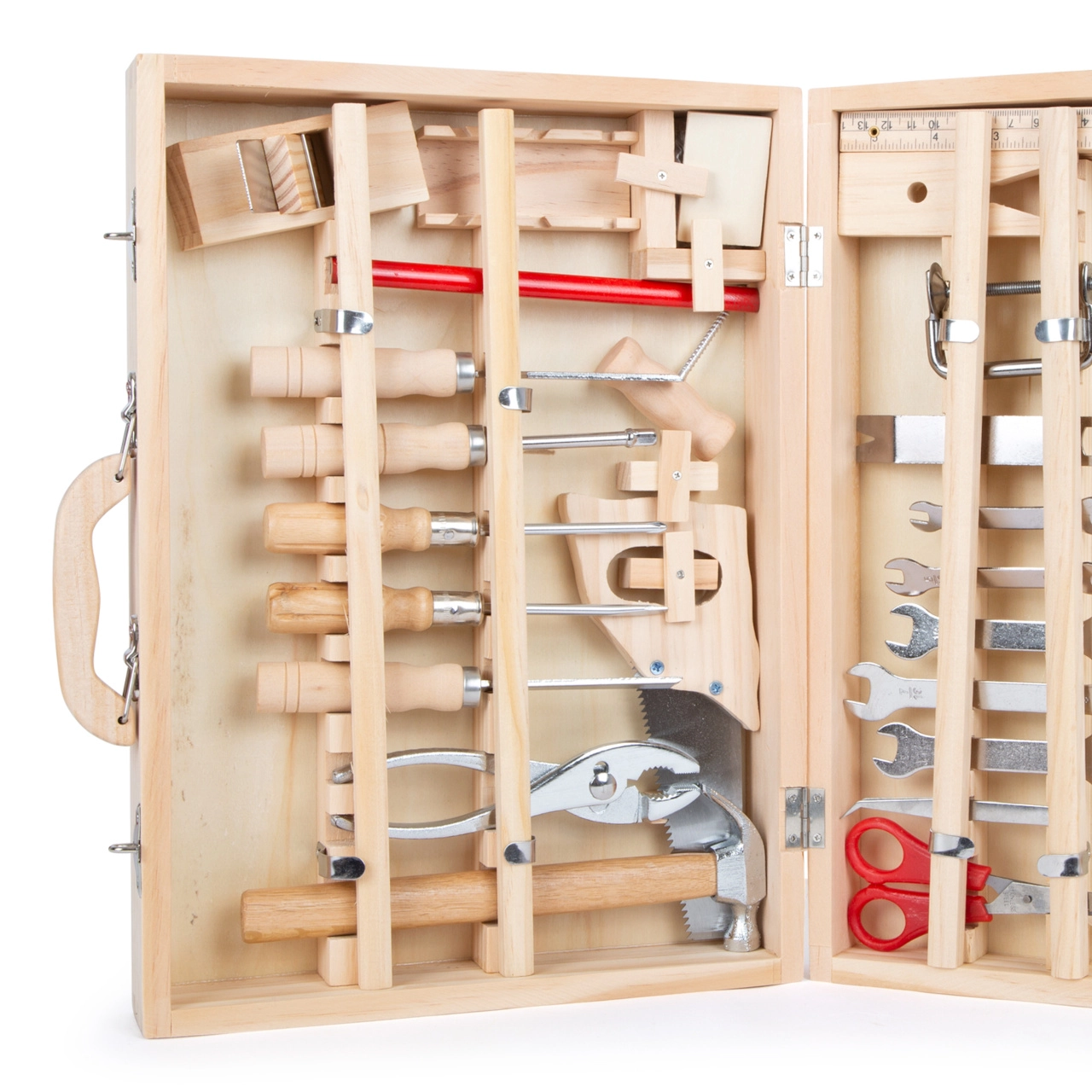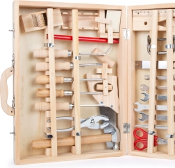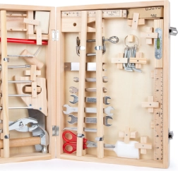 Lagaminėlyje rasite viską, ko reikia smulkiems namų projektams ir meistravimo žaidimams: raktus, atsuktuvus, pjūklą, žirkles, kaltą, dailidės pieštuką, šešiakampį raktą, plaktuką ir kitus priedus. 48 dalių rinkinys lavina smulkiąją motoriką, susikaupimą ir kūrybiškumą.