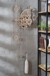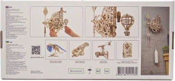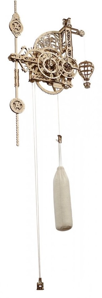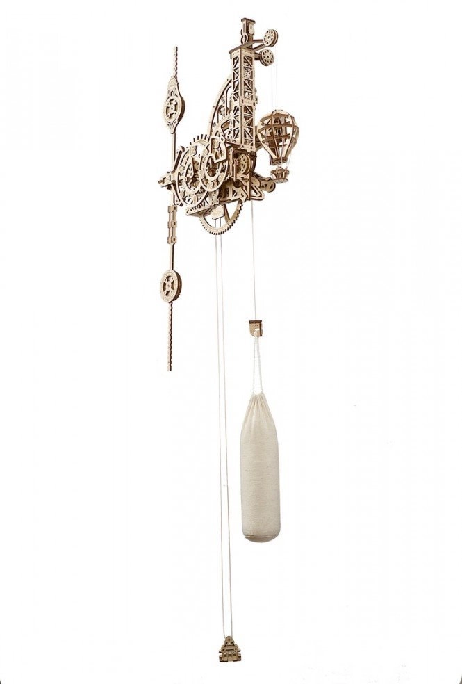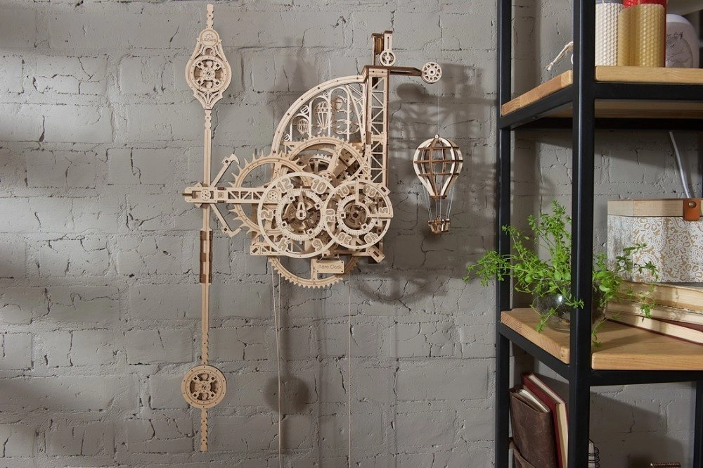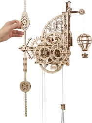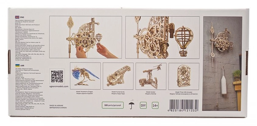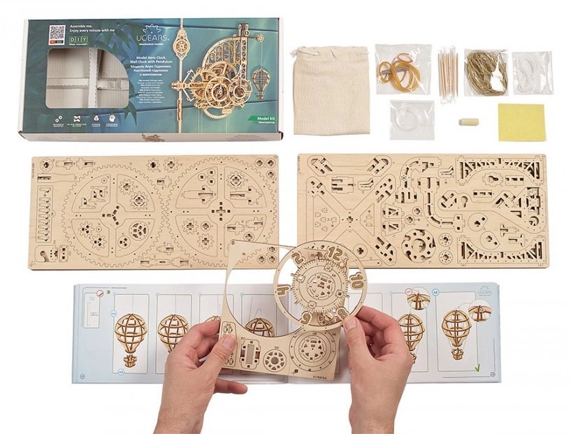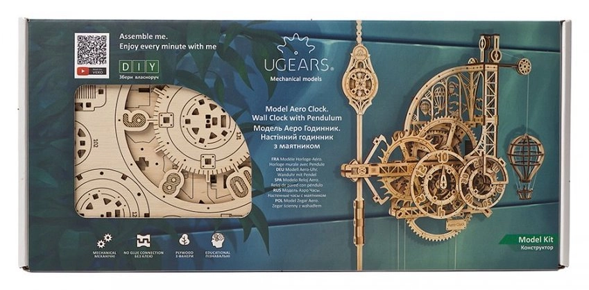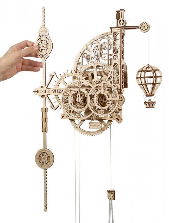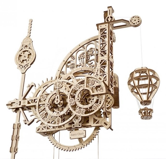 Ugears Aero – tai mechaniniai sieniniai laikrodžiai iš aukštos kokybės faneros, kuriuos surinksite patys be klijų. Įtraukiantis vaizdas į atidengtą laikrodžio mechanizmą su švytuokle ir svoriu suteikia unikalią tikslios inžinerijos patirtį. Laiką skaitote nuo dviejų prieš laikrodžio rodyklę besisukančių ciferblatų, o dekoratyvinis oro baliono modelis reguliariai kyla ir kas pilną valandą nusileisdamas tai primena.