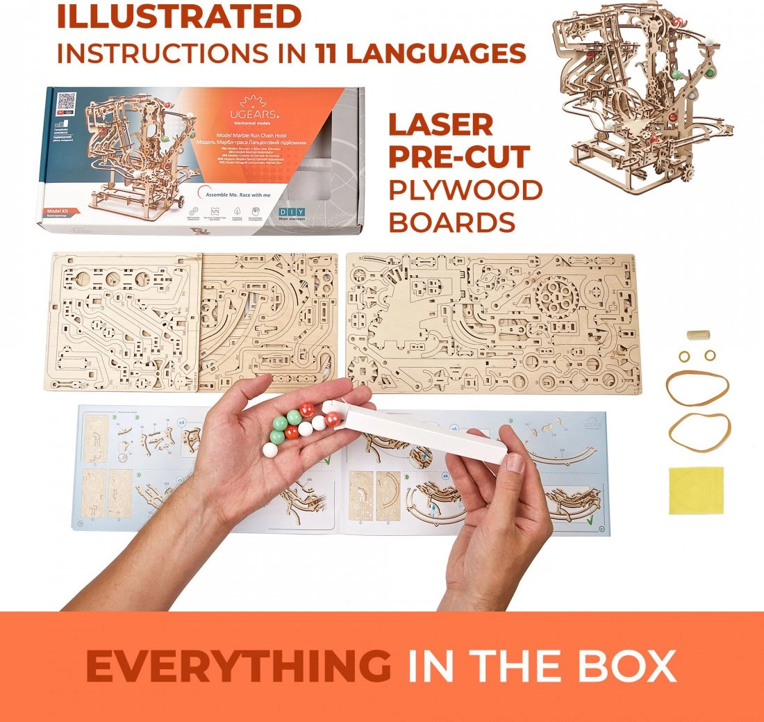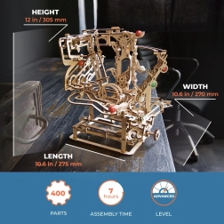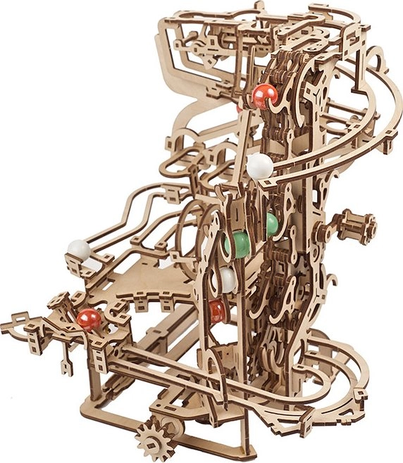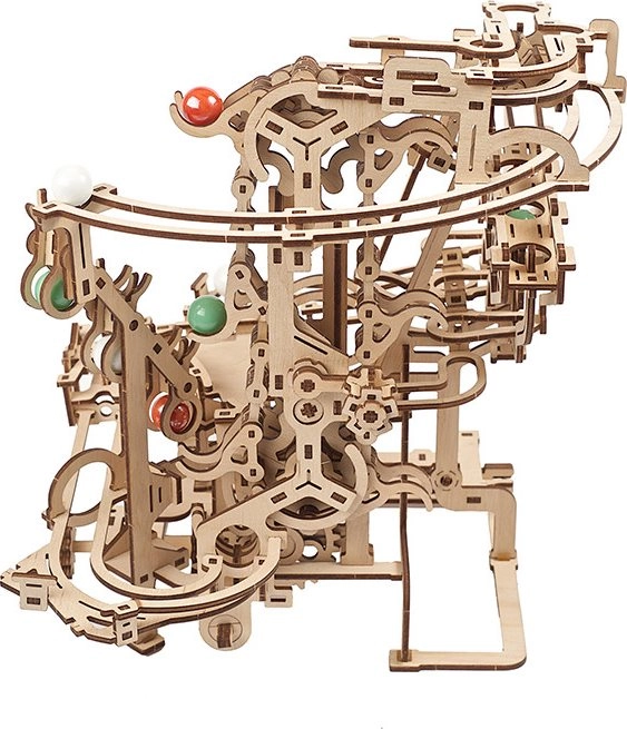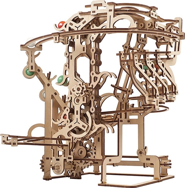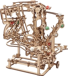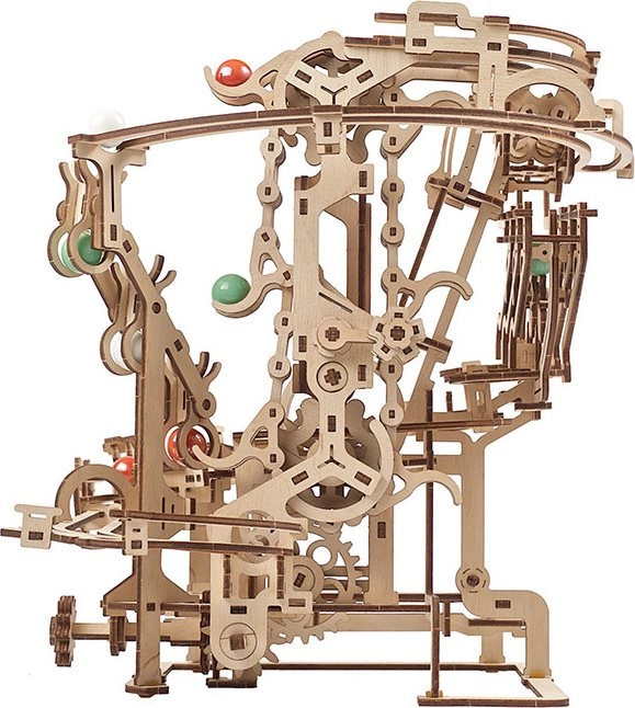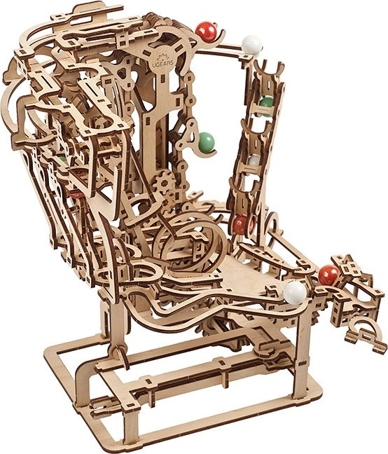 Ši preciziška iš kokybiškos faneros pagaminta rutulinė trasa siūlo modeliavimo malonumą, edukacinę vertę ir atpalaiduojantį reginį. Rankiniu būdu varomas grandininis keltuvas tolygiai pakelia rutuliukus į startą, iš kur jie leidžiasi trimis atskiromis sekcijomis, kiekvienoje – unikali pagrindinė kliūtis. Atviras dizainas išryškina veikiančią mechaniką ir smulkias detales.