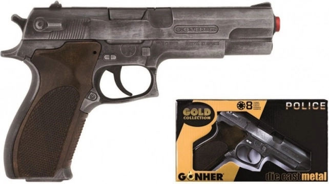 Šis policinis pistoletas iš Gold Edition leidimo išsiskiria realistišku dizainu, tvirta metaline konstrukcija ir patikimu mechanizmu, pritaikytu aštuonių šūvių kapsulėms. Dėl kompaktiškų matmenų patogiai laikomas rankoje ir idealiai tinka linksmam žaidimui ar teminiams kostiumams.