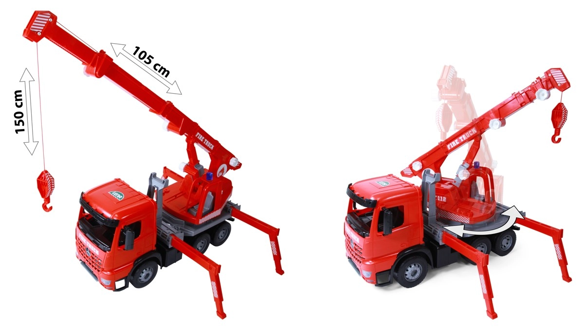 Šis raudonas MERCEDES ACTROS kranas iš Lena sužavės mažuosius statytojus. Dėl pasukamos strėlos, veikiančios gervės su lynu, ištraukiamų stabilizavimo kojų ir ratų fiksavimo pleištų vaikams suteikiamas autentiškas ir saugus žaidimas su realistiškomis funkcijomis. Pagamintas Čekijoje iš patvaraus plastiko, tinkamas naudoti tiek viduje, tiek lauke.