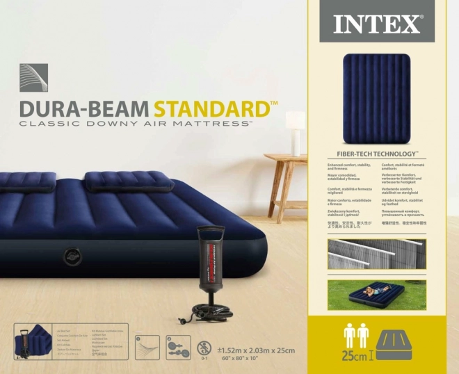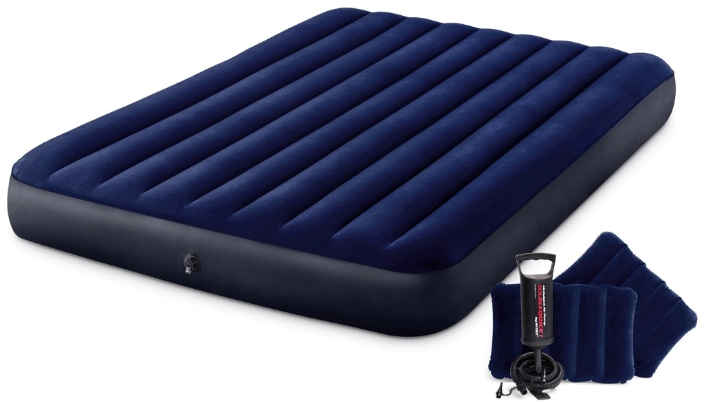 Praktiškas pripučiamas INTEX čiužinys dviem asmenims: matmenys 203 × 152 × 25 cm, minkštas veliūrinis paviršius ir stabili konstrukcija patogiam miegui namuose ir kelionėse. Pakuotėje rasite rankinį stūmoklinį siurblį, 2 pripučiamas pagalves ir remonto lopą. Dėl Boston vožtuvo pripūtimas ir išleidimas yra greitas ir paprastas.