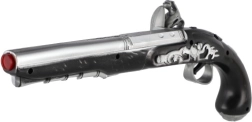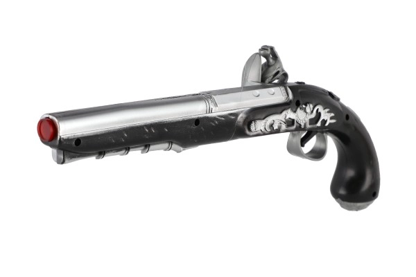 Dekoratyvinis žaislinis pistolas su raižiniais ir matomu raudonu galiuku saugiam žaidimui suteiks išskirtinumo kiekvienai piratų misijai.