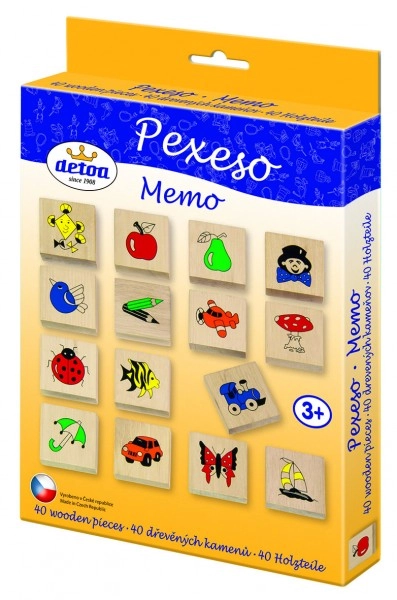Detoa medinis atminties žaidimas yra puikus pasirinkimas vaikams nuo 3 metų. Rinkinyje yra 40 detalių, kurių matmenys 4x4x1 cm, papuoštų spalvingais paveikslėliais, padedančiais vaikams mokytis skirtingų simbolių ir spalvų. Svarbiausios savybės: