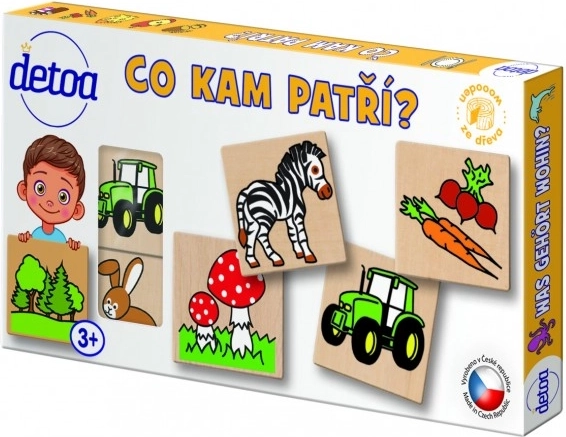 Detoa medinė dėlionė Kur kas tinka yra didaktinis žaidimas, padedantis vaikams atpažinti daiktus ir priskirti juos tinkamam paveikslėliui. Šis žaidimas idealiai tinka gerinti vaikų nuo 3 metų loginį mąstymą ir atmintį.