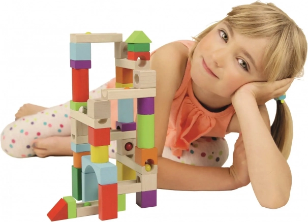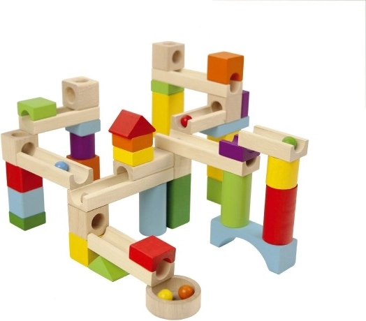 Rinkinys iš spalvotų medinių blokelių ir takelių suteikia begalines trasos konstravimo galimybes, kartu lavina smulkiąją motoriką ir kūrybiškumą.