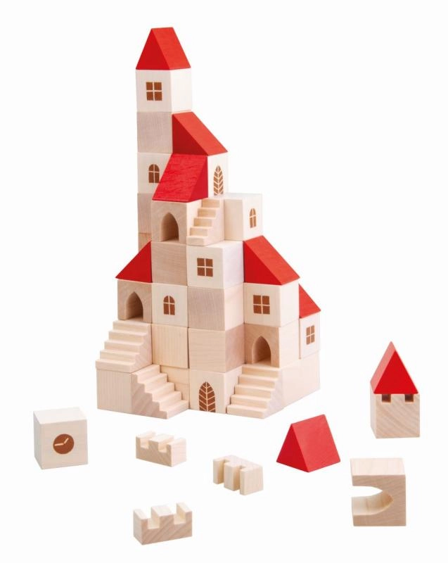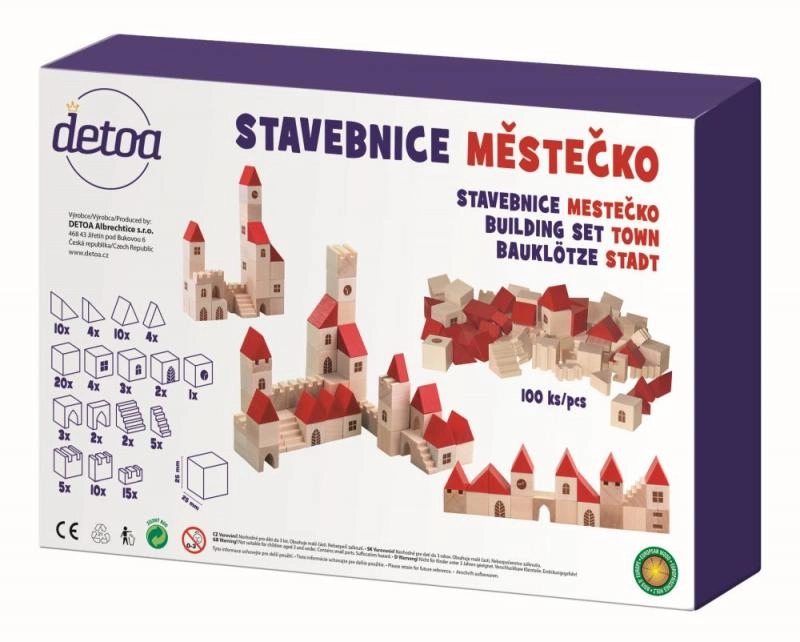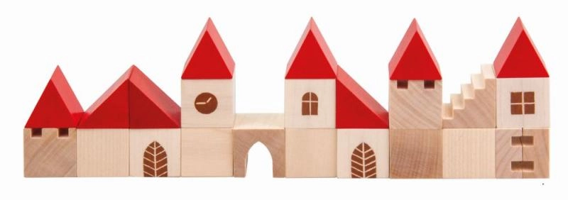 Ši medinė konstravimo rinkinio dėžutė turi 100 detalių įvairių formų ir dydžių, leidžiančių vaikams kurti savo mažą miestelį. Dėl spalvingo dizaino su raudonais stogeliais ir natūraliu medžiu šis rinkinys yra ne tik gražus, bet ir visiškai funkcionalus vaizduotę skatinančiam žaidimui. Padeda lavinti smulkiąją motoriką ir erdvinį suvokimą vaikams.