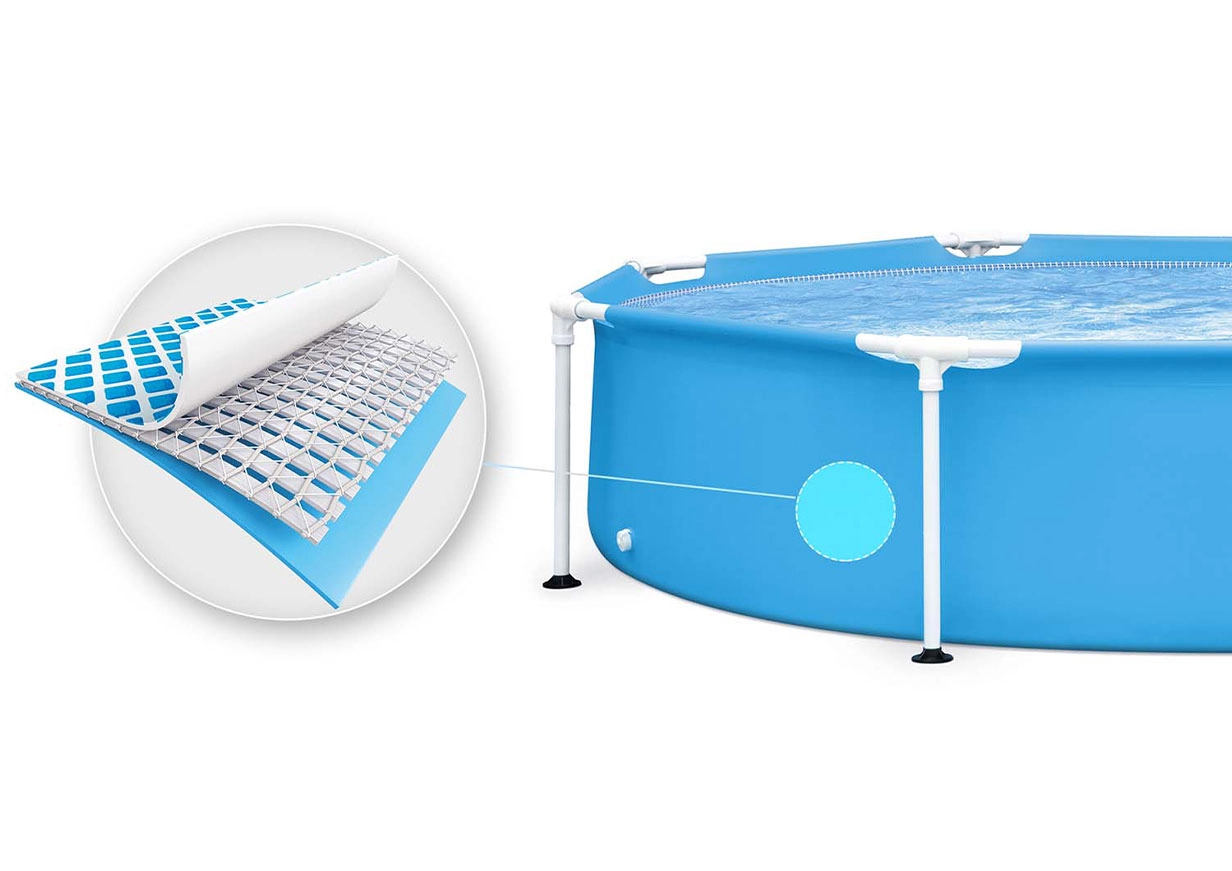 Plieninis rėmas užtikrina aukštą stabilumą ir saugų naudojimą. Baseinas gerai išlaiko formą, o vandens lygis yra optimalus tiek vaikams, tiek suaugusiesiems.