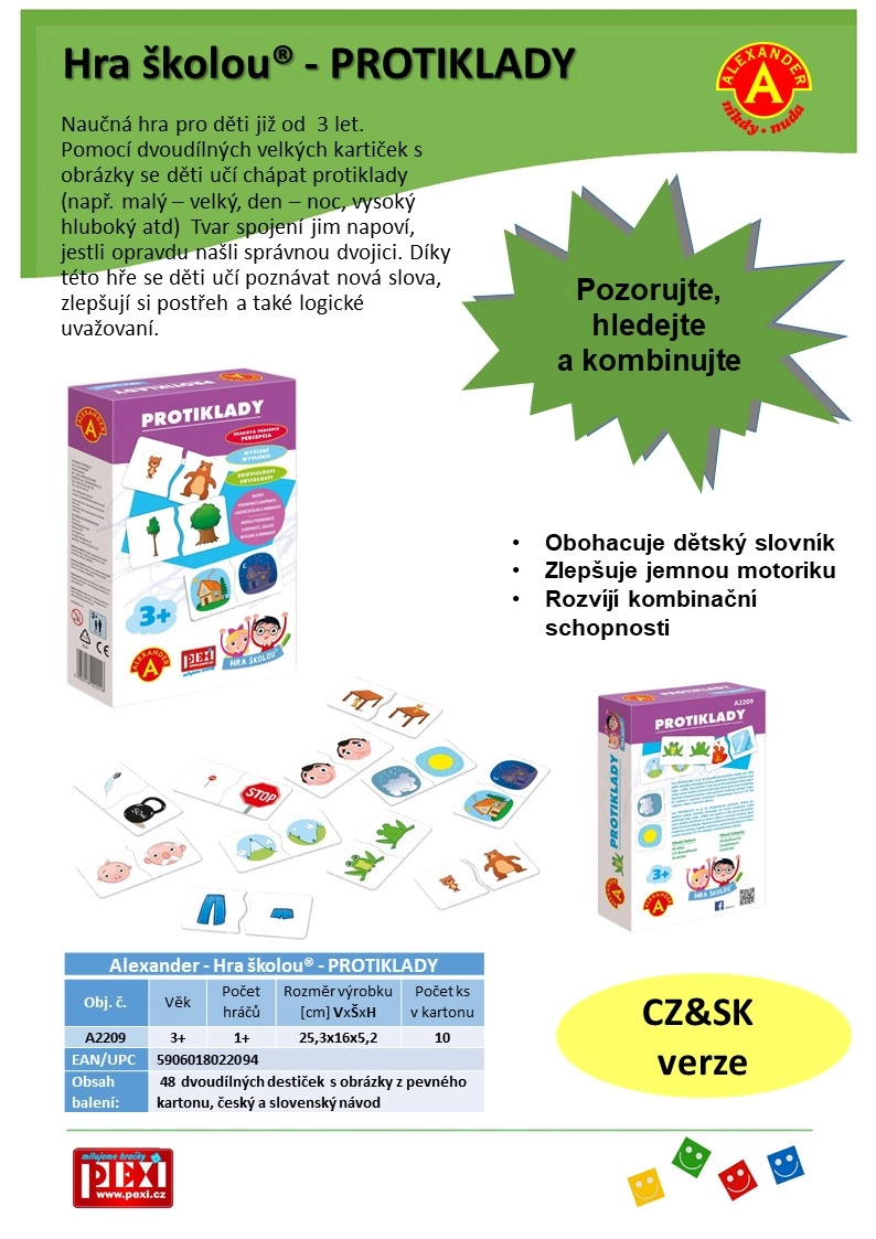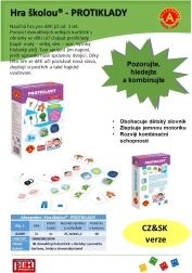 - 48 dviejų dalių lentelės su paveikslėliais, žaidimo instrukcija čekų ir slovakų kalbomis