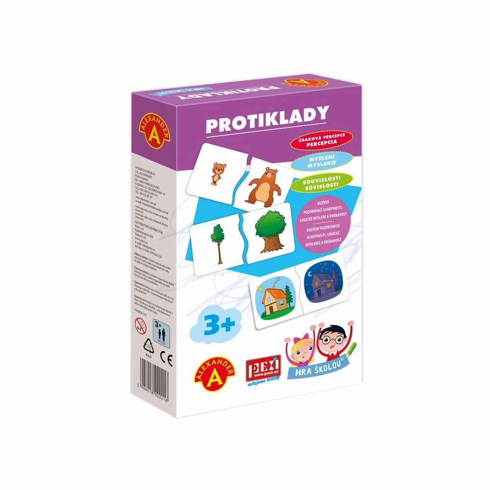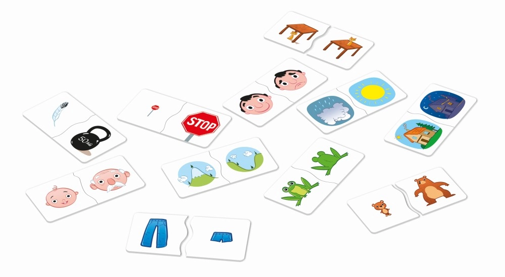 Smagus edukacinis žaidimas patiems mažiausiems, padedantis vaikams suprasti priešybes naudojant dideles dviejų dalių korteles. Dėl unikalaus sujungimo formos vaikai iš karto supranta, ar rado tinkamą porą. Lavina žodyną, loginį mąstymą, dėmesį ir smulkiąją motoriką.