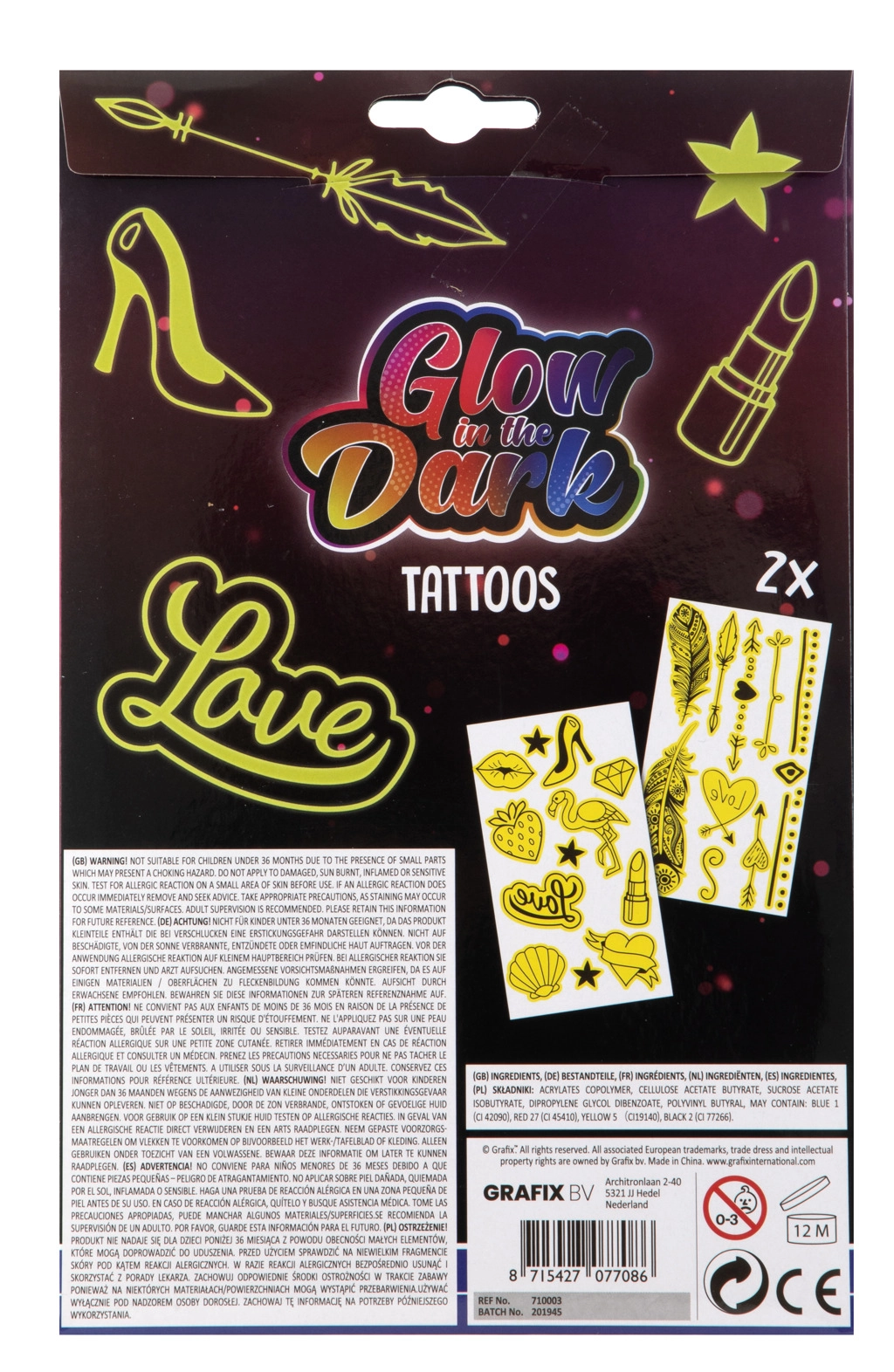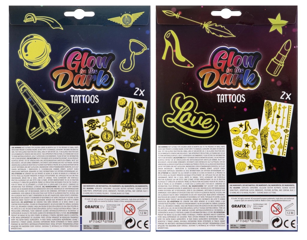 Šis šviečiančių tatuiruočių rinkinys idealiai tinka mergaitėms, norinčioms suteikti savo stiliui žavesio. Mėgaukitės įvairiais motyvais, esančiais pakuotėje, kurioje yra du tatuiruočių lapai. Tiesiog iškirpkite, uždėkite ant odos, sudrėkinkite kempinėle ir viskas! Naudojimas greitas ir smagus.