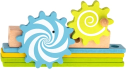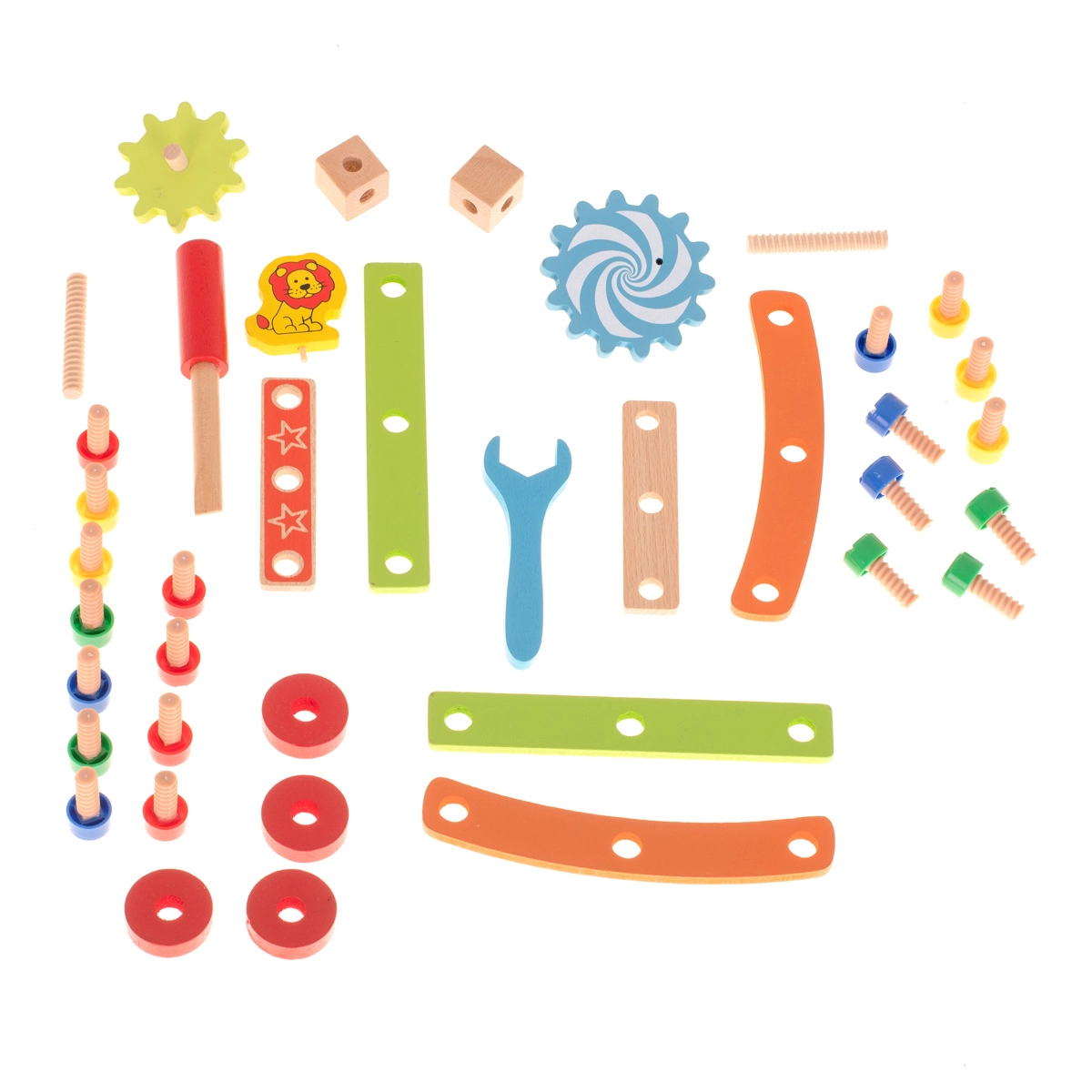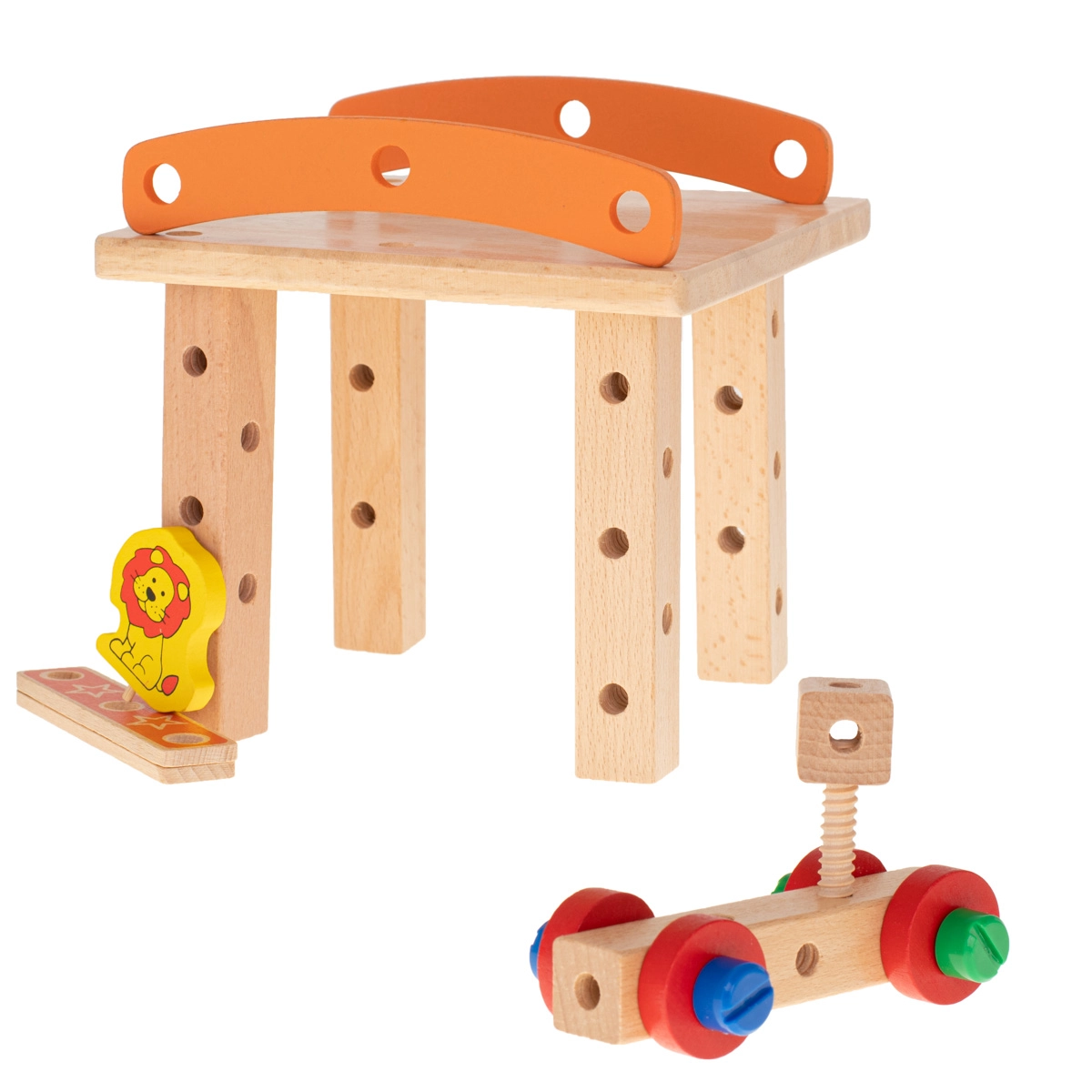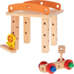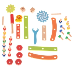 Rinkinyje yra medinis atsuktuvas ir raktas, tad mažiesiems statytojams netrūksta nieko, ko reikia. Ryškiaspalvės detalės su žaismingais motyvais (pvz., liūtuku ir krumpliaračiais) skatina kūrybišką žaidimą ir moko atpažinti spalvas. Puiki edukacinio žaislo ir dovanos idėja, kuri sudomins valandoms.
