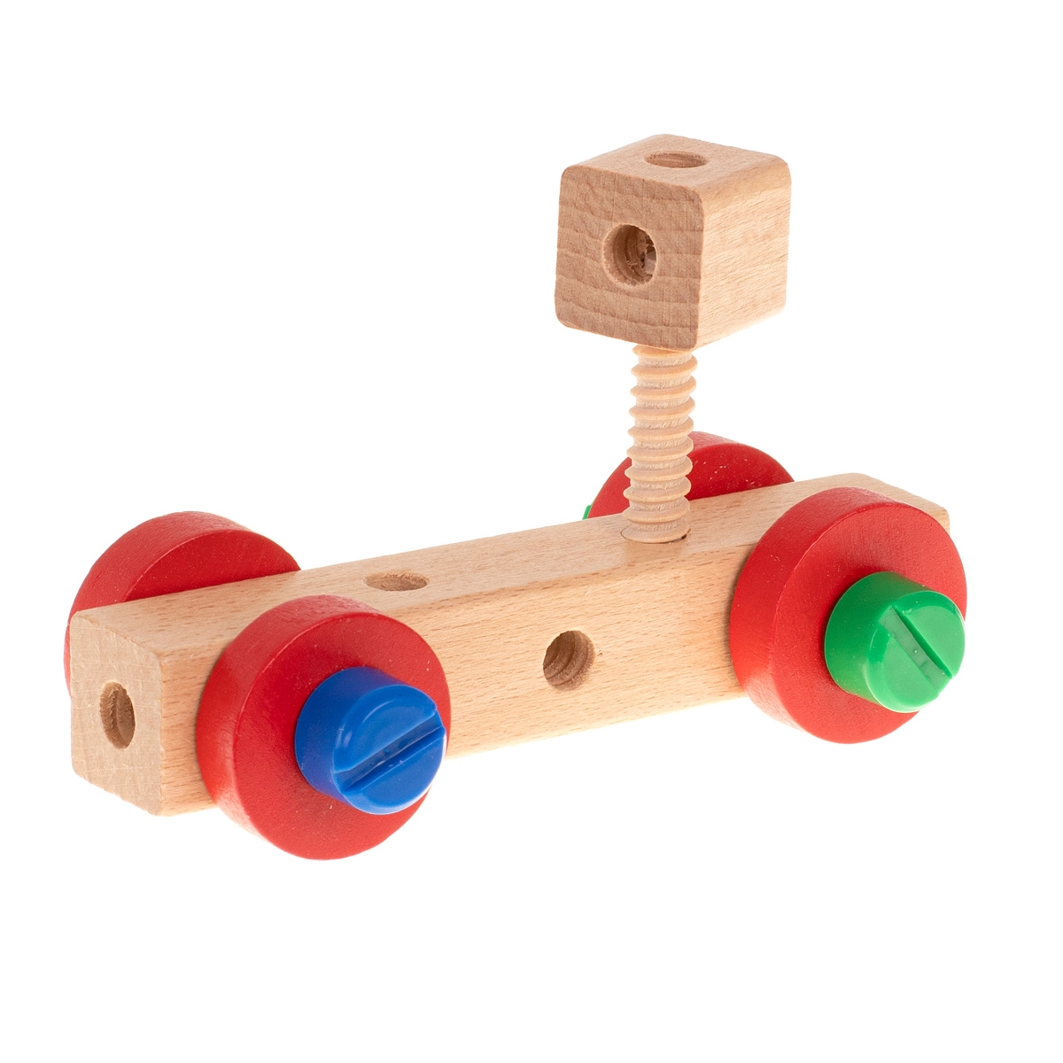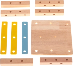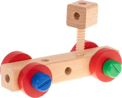 Rinkinyje yra medinis atsuktuvas, raktas, varžtai ir veržlės – vaikai mokosi teisingai jungti detales ir lavina smulkiąją motoriką.