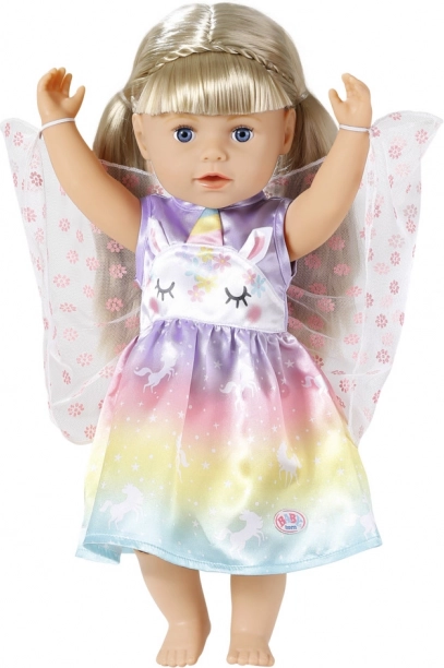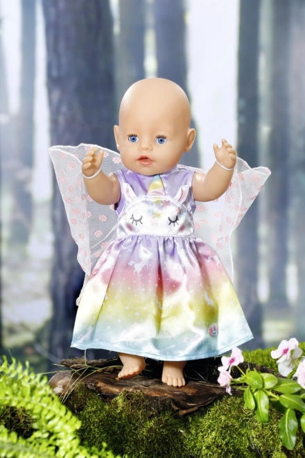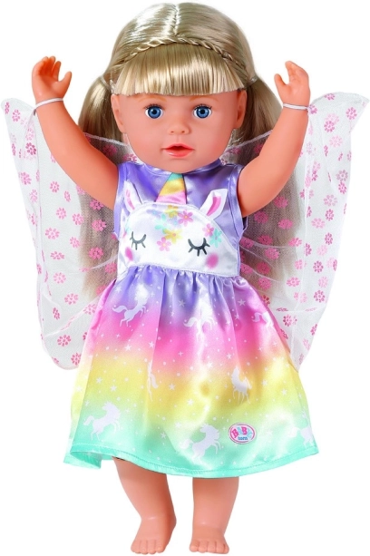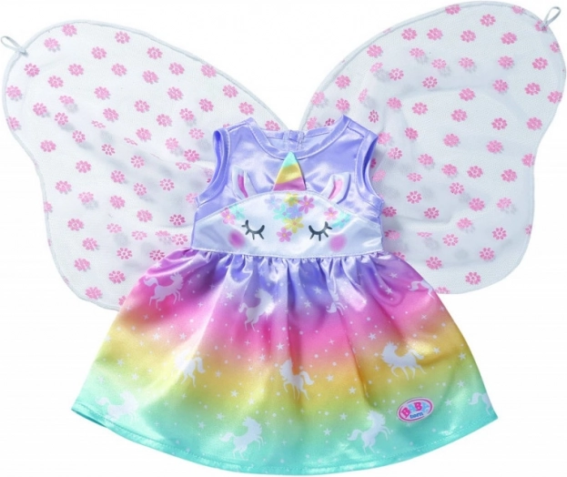 Paverskite kiekvieną žaidimą pasakišku nuotykiu. Ši BABY born lėlei skirta suknelė 43 cm dydžio (tinka ir 39–46 cm) žiba vaivorykštės perėjimais, vienaragių motyvais ir švelniais sparneliais. Dėl kokybiškų medžiagų ji atlaiko daugybę persirengimų, arbatėlių puotas ir karališkas eitynes.