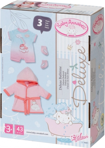 Leiskite savo Baby Annabell patirti magiškas akimirkas su šiuo stilingu chalatu ir pižamėle. Chalatas papuoštas sparneliais, todėl jis yra ne tik madingas, bet ir patogus aksesuaras žaidimams. Po chalatu lėlė dėvi trumpą kombinezoną su avytės, besimėgaujančios vaivorykštiniu dušu, atspaudu. Kad lėlės kojytės būtų jaukiai šiltos, rinkinyje taip pat yra rožinės kojinytės su sparnelių piešinėliais.