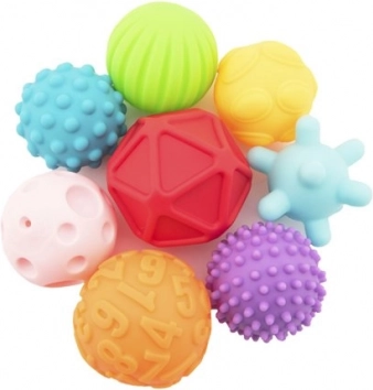 Atraskite aštuonių tekstūruotų kamuoliukų rinkinį, sukurtą vaiko sensoriniam suvokimui ir koordinacijai lavinti. Įvairios spalvos ir tekstūros užtikrina interaktyvų ir smagų žaidimą.