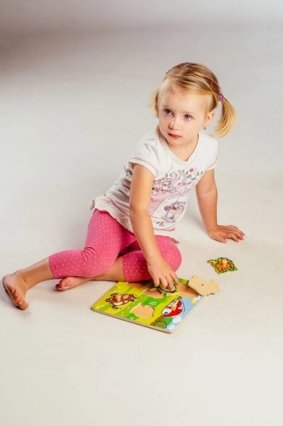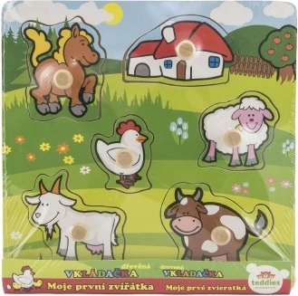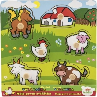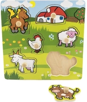 Šioje dėlionėje yra iš viso 5 spalvingi gyvūnėliai: arkliukas, ožka, avytė, vištelė ir karvė, kuriuos lengva paimti dėl mažų medinių rankenėlių. Kiekviena detalė turi savo vietą ant medinio pagrindo, o tai padeda vaikams išmokti teisingai sudėti kiekvieną detalę.