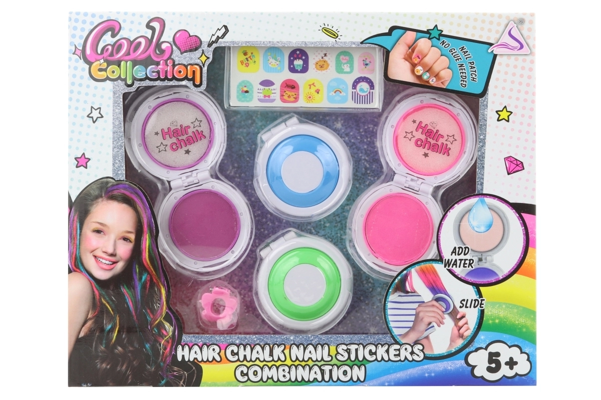 Šis žaismingas rinkinys „Cool Collection – Hair Chalk & Nail Stickers“ kasdienę šukuoseną ir nagus paverčia mažais meno kūriniais. Keturi sodrūs atspalviai kompaktiškuose dėkluose su aplikatoriais tepasi greitai ir švariai, neapsunkina plaukų ir lengvai išsiplauna. Į pakuotę taip pat įeina spalvingi nagų lipdukai su mielais motyvais, kurie suteikia vaikams dar daugiau džiaugsmo.