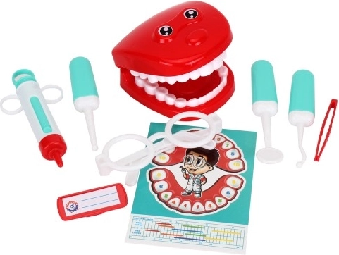 Šis spalvingas odontologo rinkinys idealiai tinka smalsiems mažiesiems gydytojams. Jame rasite viską, ko reikia linksmam žaislų „patikrinimui“: žandikaulio modelį, veidrodėlį, zondą, grąžtą, švirkštą, pincetą, akinius ir ženklelį. Taip pat pridedama aiški dantų numeracijos schema, padedanti vaikams lengvai perprasti dantų priežiūros pagrindus.