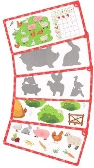 Penki spalvoti kortelių lapeliai su gyvūnėliais ir formomis padeda vaikams lavinti pažinimą, akių–rankų koordinaciją bei treniruoja atmintį ir pastabumą.