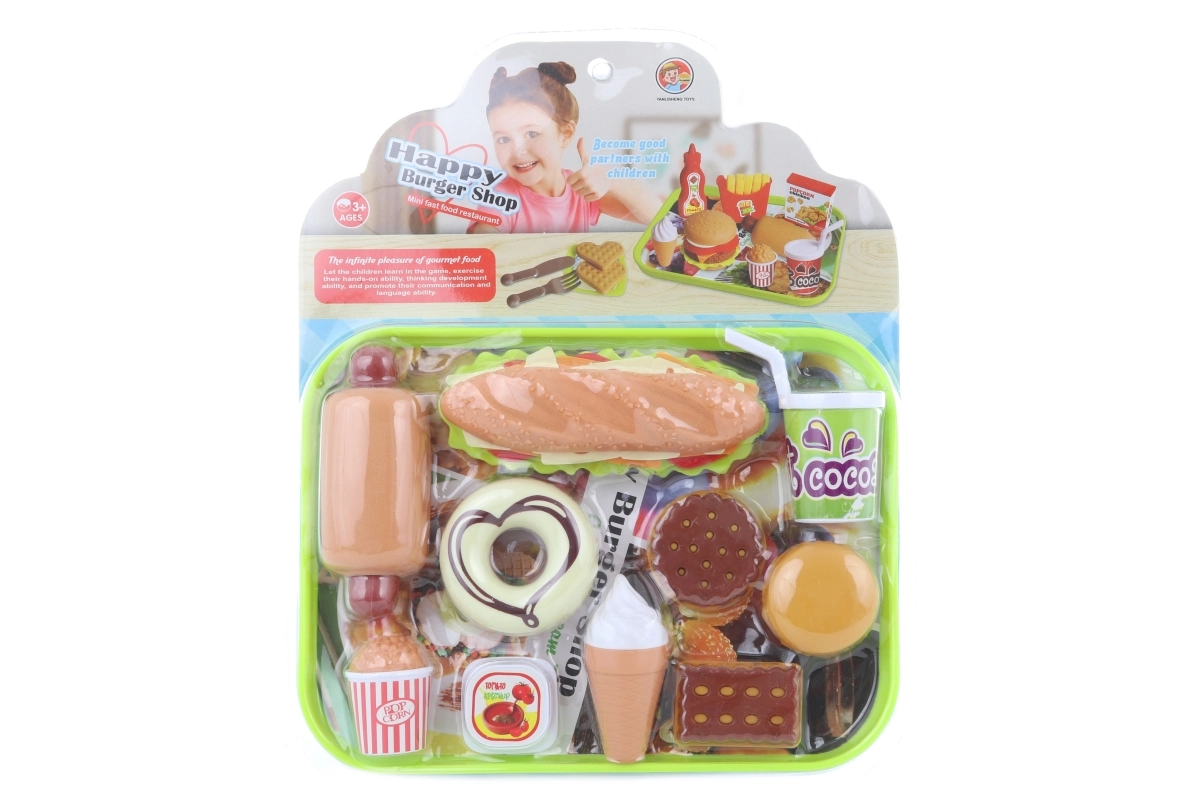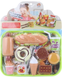 Rinkinyje yra dešrainis, spurga, sausainiai, ledai, gėrimas ir kiti priedai realistiškam gaminimo žaidimui. Puiki dovanos idėja ir puikus papildymas vaikų virtuvei ar parduotuvei.