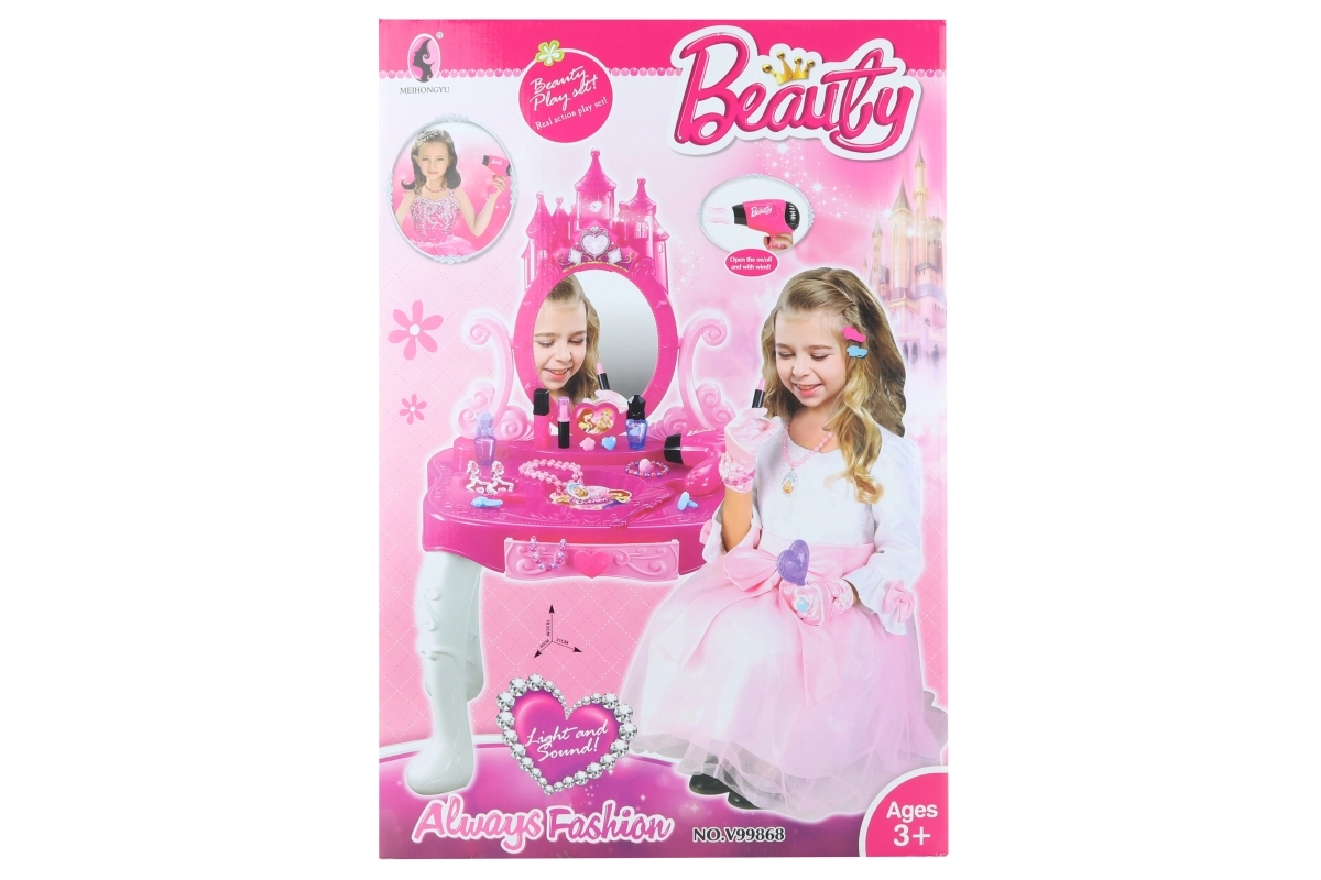 Vienu mygtuko paspaudimu staliukas nušvinta ir pradeda groti melodiją, suteikdamas žaidimui autentiškumo. Prie staliuko taip pat pridedama patogi plastikinė kėdutė. Viskas, ko jūsų vaikui reikia grožio žaidimams, yra paruošta!