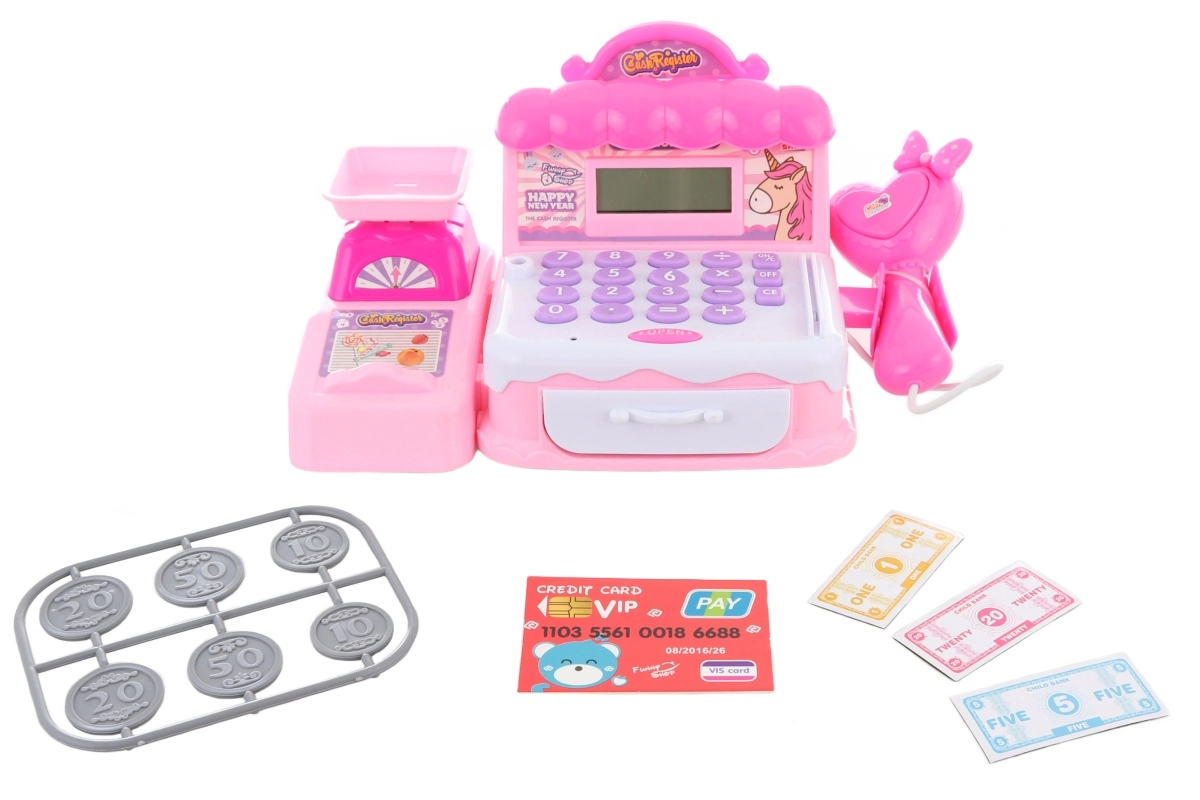 Skatinkite vaikų fantaziją su žavia vienaragio motyvo kasa. Ši plastikinė kasa turi išsitraukiantį pinigų stalčių, veikiančias svarstykles ir brūkšninių kodų skaitytuvą. Dėl šviesos ir garso efektų bei galimybės skaičiuoti ji idealiai tinka žaidimui „parduotuvė“. Rinkinyje taip pat yra popieriniai banknotai ir monetos. Maitinimas: 2× AA (nepridedama).