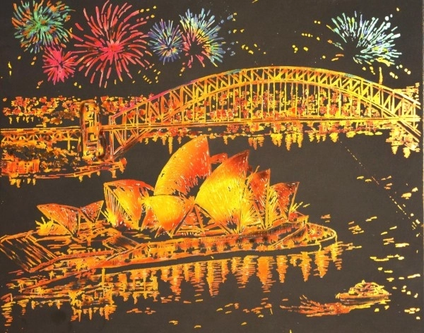 Atraskite gramdymo technikos žavesį: po juodu sluoksniu slypi auksinis pagrindas, kuris iš kiekvieno nugramdyto brūkšnio sukuria kontrastingą, elegantišką efektą. Ikoninės Sidnėjaus operos motyvas naktiniame vaizde pradžiugins ir pradedančiuosius, ir pažengusius, o galutinis paveikslėlis taps originalia dekoracija.