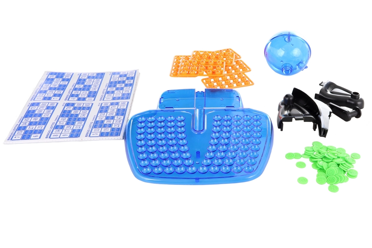 Įeina žaidimo lenta, burtų kamuolys, 90 numeruotų kamuoliukų ir 48 žaidimo kortelės.