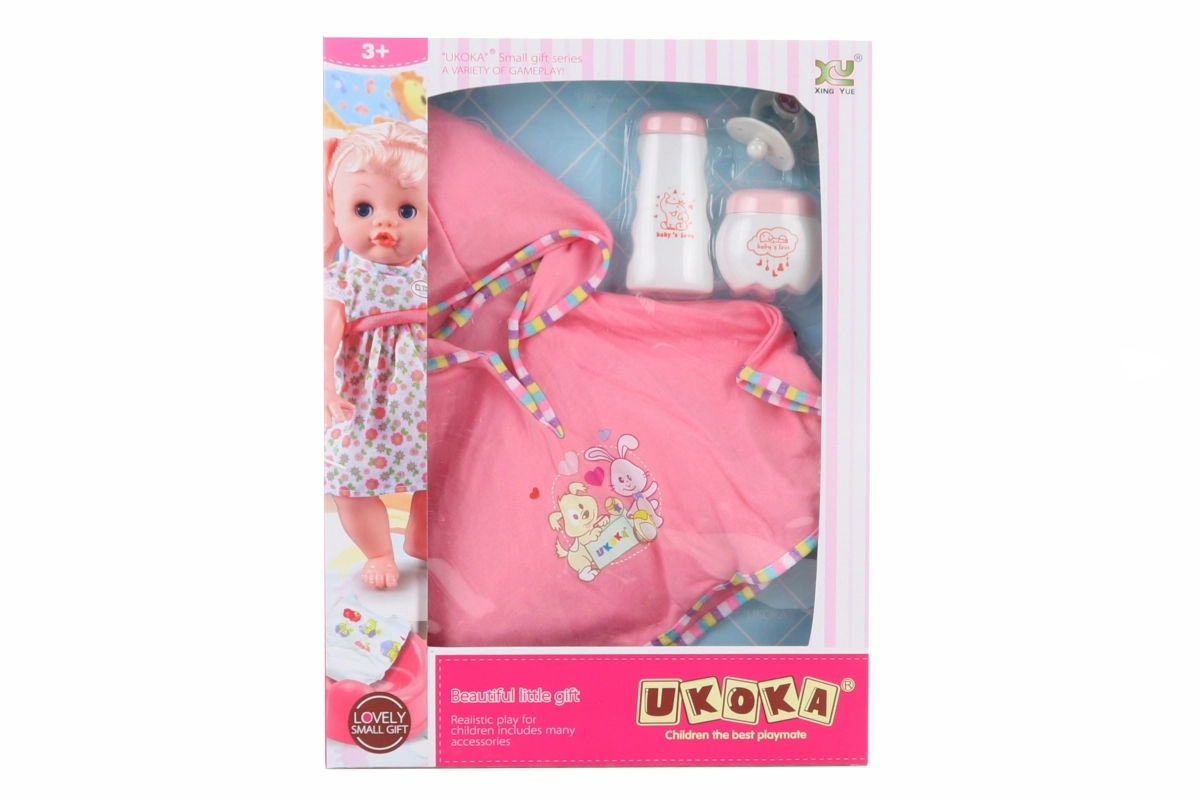 Praturtinkite žaidimą su lėlėmis praktiškais ir mielais priedais. Ši 45 cm lėlei skirta rinkinio versija apima audinio pončą, plastikinį čiulptuką ir dvi plastikines kosmetikos buteliukų pakuotes. Idealu vaikams nuo 3 metų, skatina vaizduotę ir rūpinimosi įgūdžius.