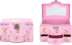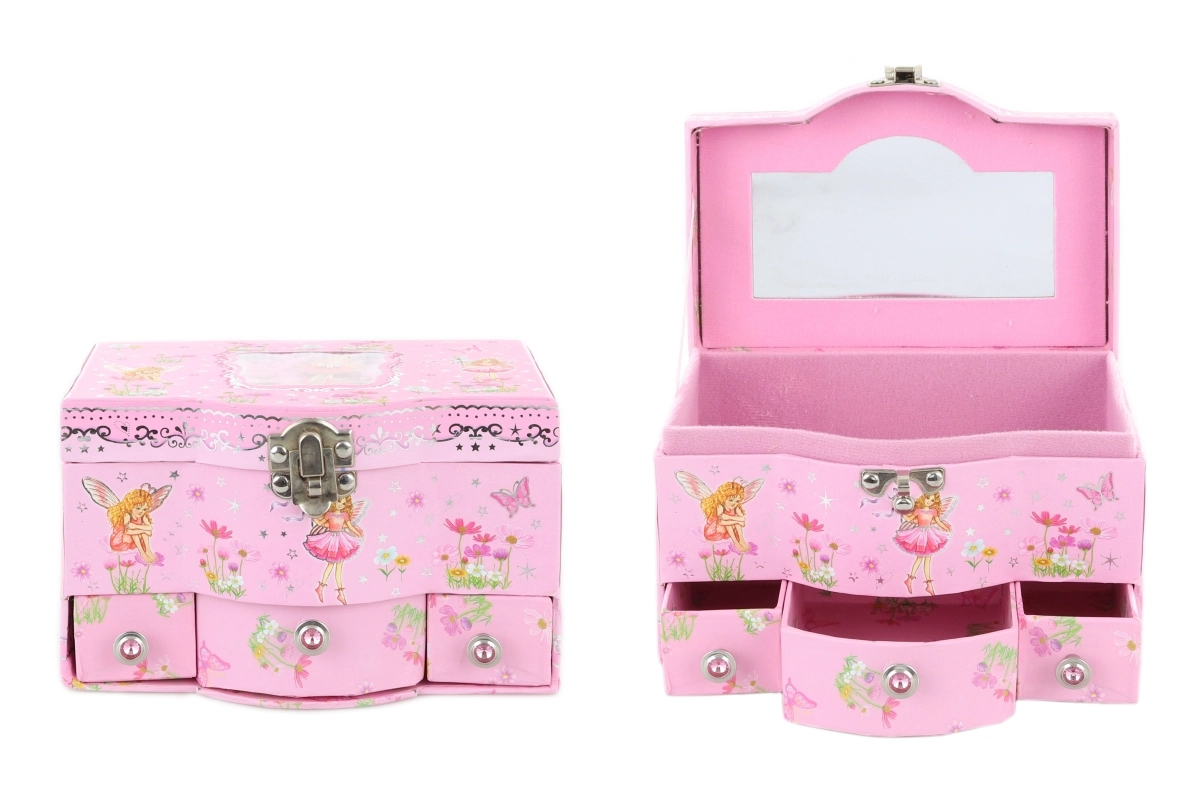 Elegantiška papuošalų dėžutė vaikams ir suaugusiems siūlo patogų smulkių lobelių laikymą. Vidinėje dangtelio pusėje yra veidrodėlis, o apačioje rasite 3 erdvius stalčiukus papuošalams ir aksesuarams. Kompaktiški matmenys apie 17 × 11,5 × 10 cm tinka tiek komodai, tiek tualetiniam staliukui. Tinka nuo 3 metų.