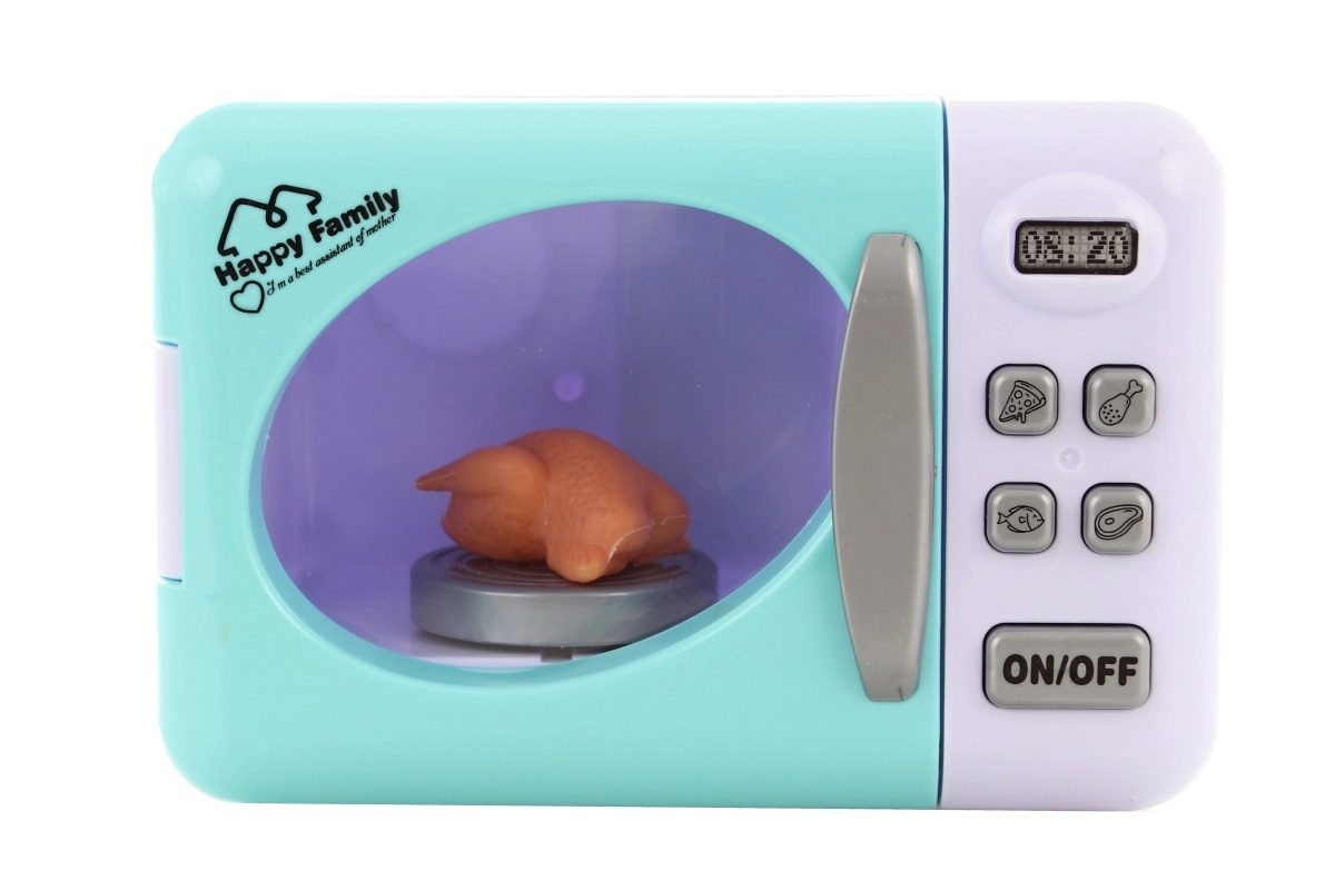 Linksma vaikiška baterijomis veikianti mikrobangų krosnelė mažiesiems virėjams nuo 3 metų. Įjungus, maistas ant lėkštės sukasi, o krosnelė šviečia, todėl gaminimo žaidimas tampa dar realesnis. Į komplektą įeina plastikinė višta, kad būtų galima žaisti iš karto ir lavinti fantaziją.