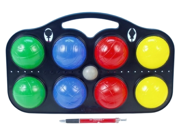 Aštuonių plastinių petankės kamuolių rinkinys, idealiai tinkantis linksmoms veikloms lauke. Kiekvienas kamuolys turi unikalią spalvą, kad žaidimo metu būtų lengva atpažinti. Rinkinys pateikiamas praktiškoje pakuotėje, kuri palengvina tiek laikymą, tiek nešiojimą mokomųjų kamuolių.