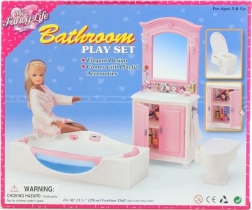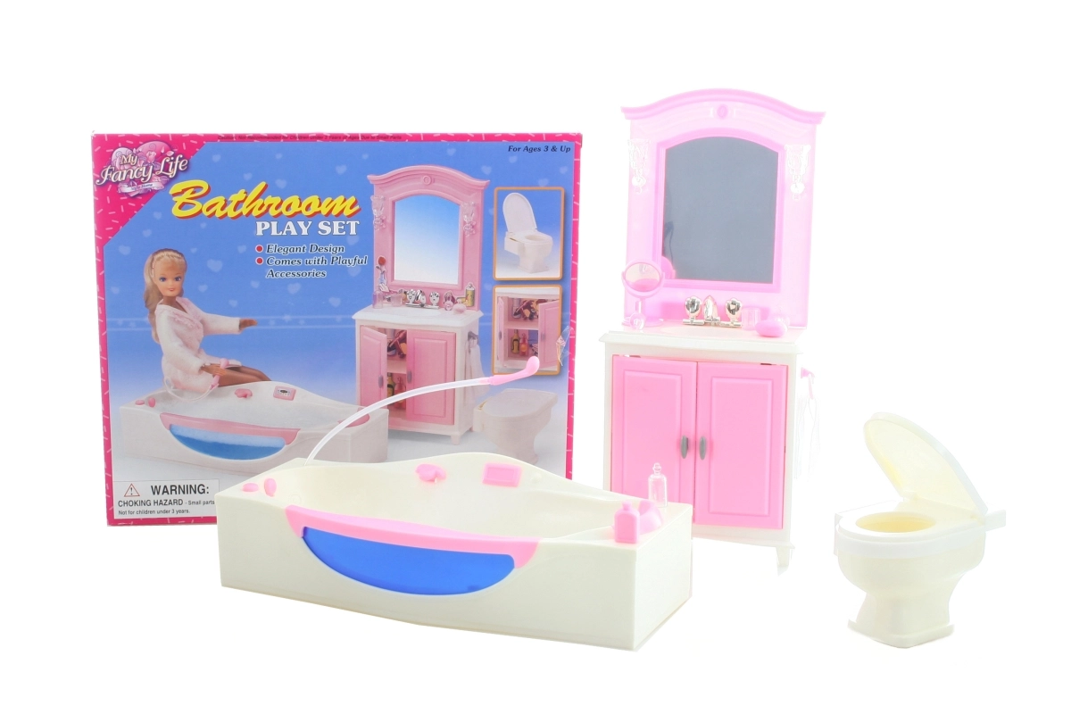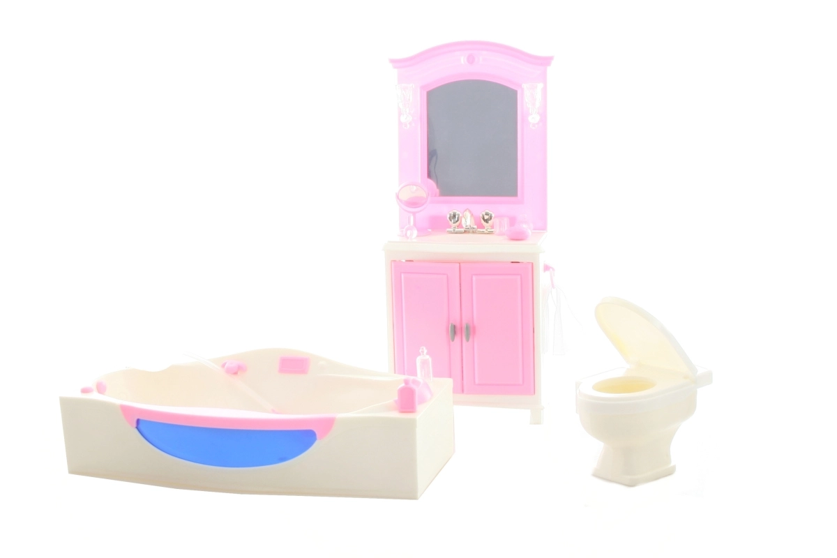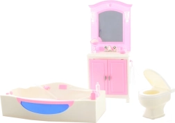 Rinkinyje yra tualetinis staliukas su praustuvu, vonia ir tualetas, taip pat maži priedai, kurie sukuria tikros vonios kambario atmosferą. Plastikinė konstrukcija užtikrina lengvą priežiūrą ir ilgą tarnavimo laiką kasdien žaidžiant.