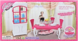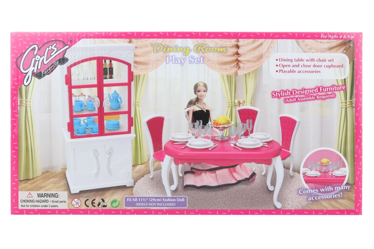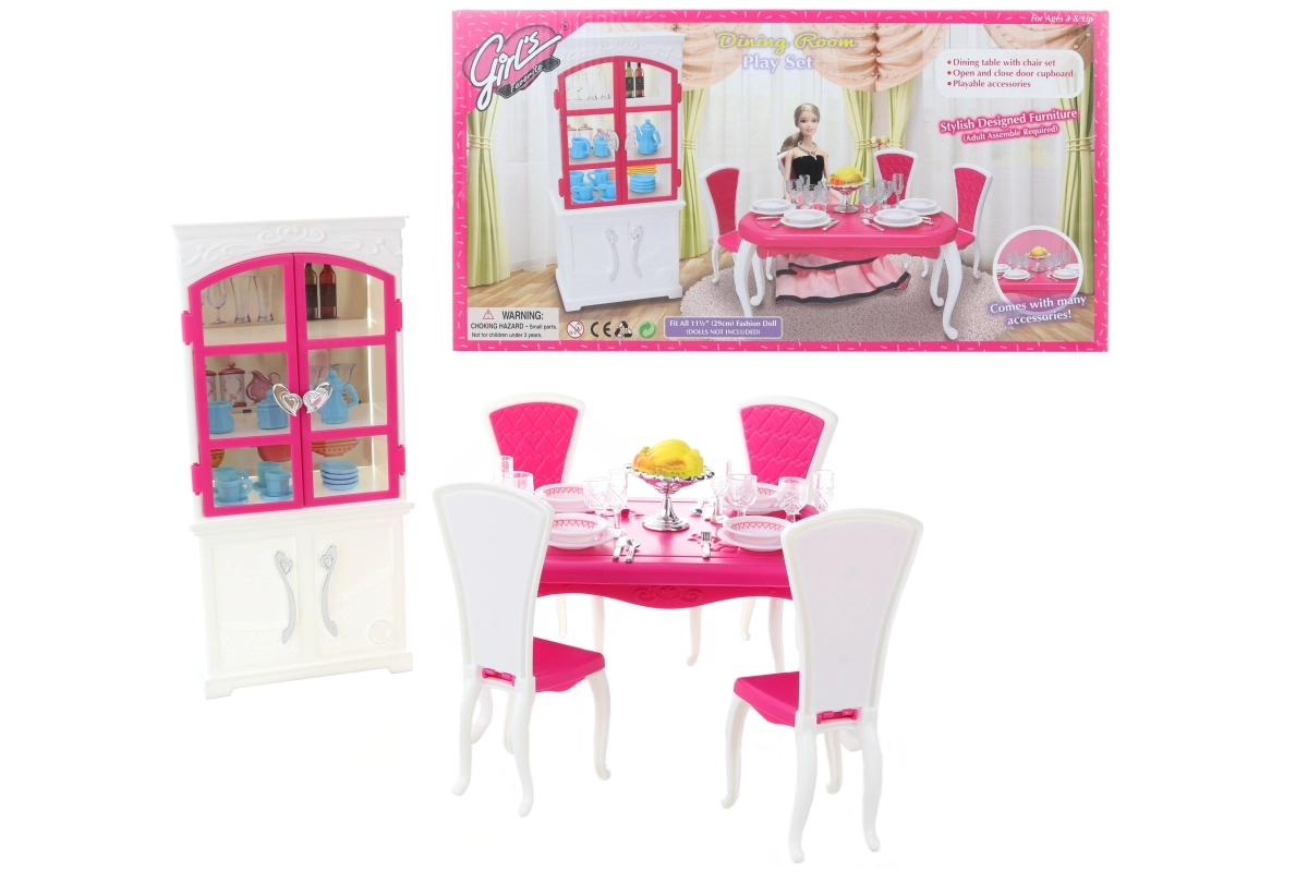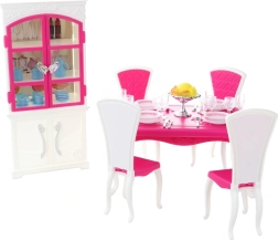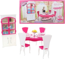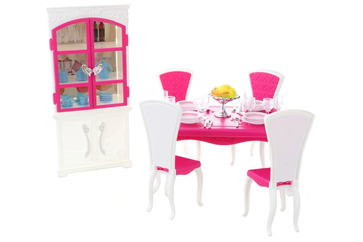 Glorie valgomojo rinkinys lėlėms siūlo pilną valgymo patirtį su elegantišku plastikiniu stalu, keturiomis kėdėmis ir spintele, papildytą lėkštėmis, taurėmis, įrankiais ir dekoratyviniais priedais.