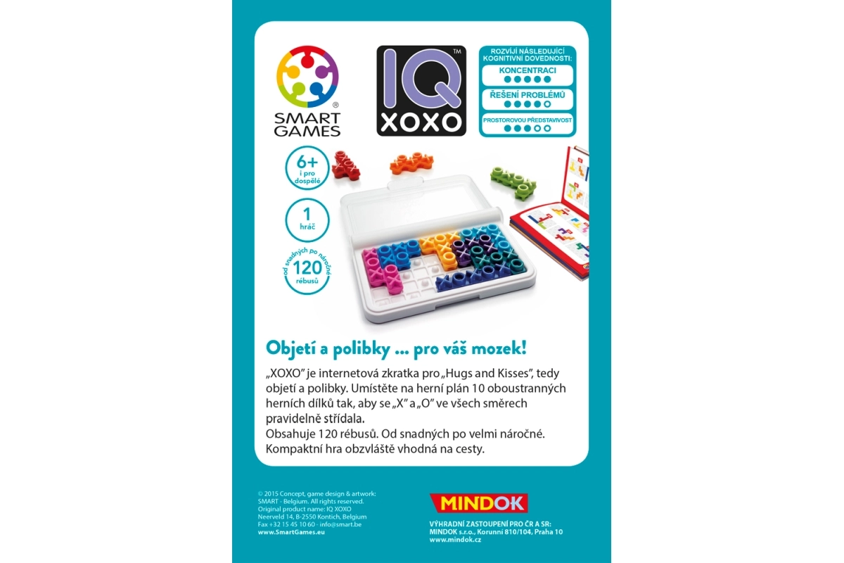 Mindok Smart IQ XOXO siūlo jūsų smegenims ilgalaikį ir įdomų iššūkį. Išdėliokite ant žaidimo lentos 10 dvišalių detalių taip, kad „X“ ir „O“ reguliariai kaitaliotųsi.