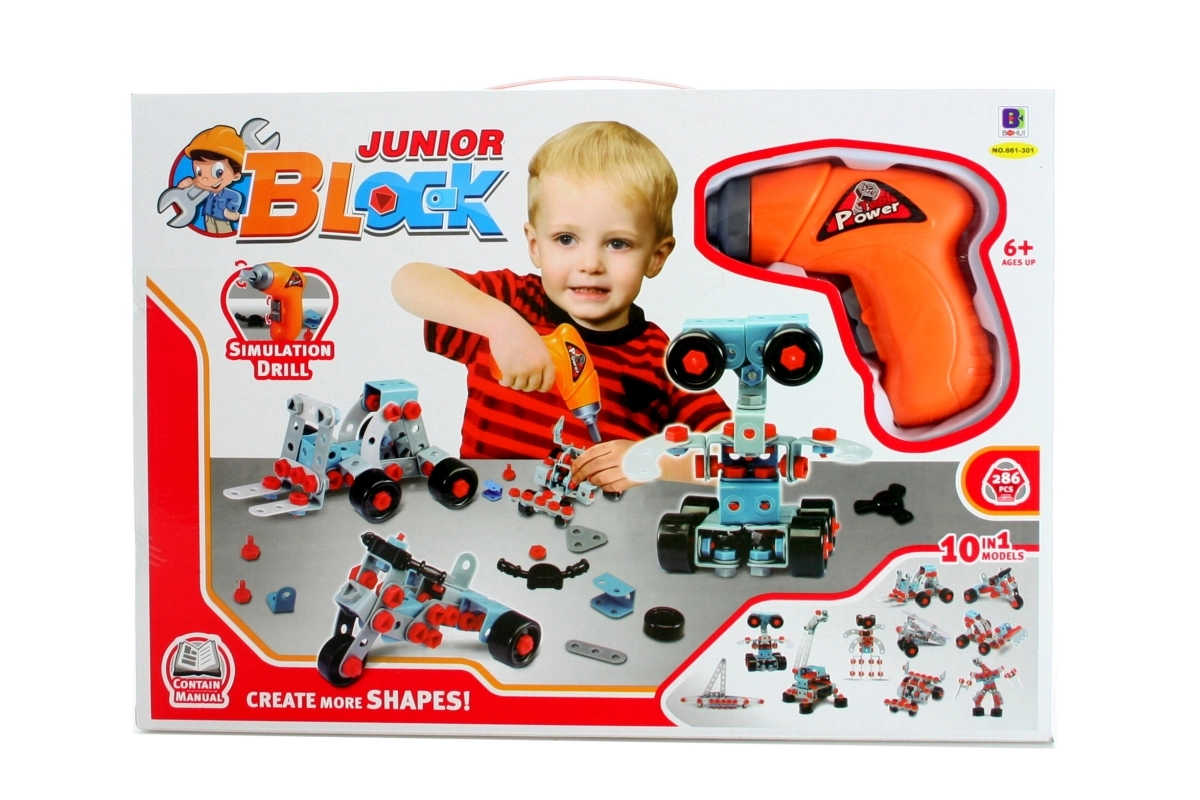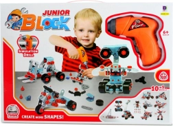Lavinkite kūrybiškumą ir smulkiąją motoriką su universaliu Junior Block konstruktoriu. Rinkinyje yra 286 detalės, įskaitant imituojamą akumuliatorinį gręžtuvą, ir jis leidžia vaikams nuo 6 metų surinkti net 10 skirtingų modelių – transporto priemonių, robotų ir kitų konstrukcijų. Patogi pakuotė (apie 41 × 29 × 6 cm) ir lengvas varžtų sukimasis su plastikiniais varžtais ir veržlėmis užtikrina valandas pramogų. Gręžtuvas veikia su 2× AA baterijomis (nepridedamos).