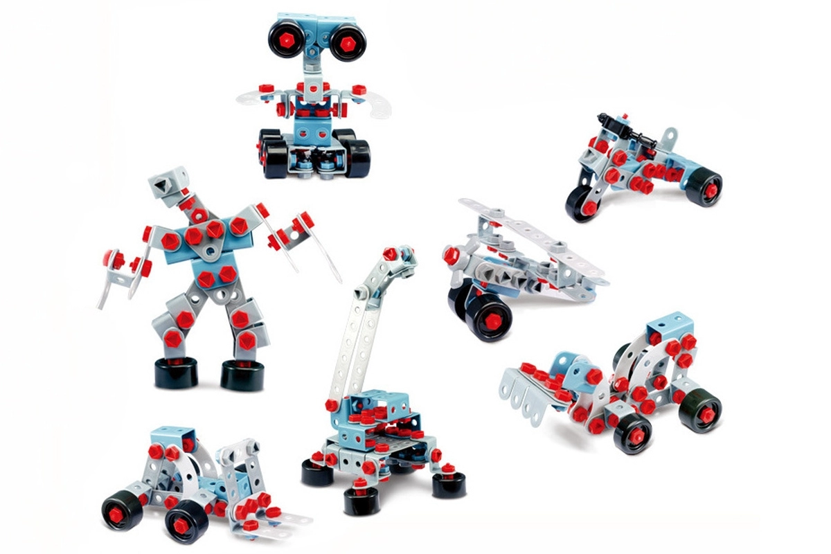Modulinės sijos, jungtys, ratai ir varžteliai leidžia daug kartų perdaryti modelius. Idealu smulkiajai motorikai ir techniniam mąstymui lavinti.