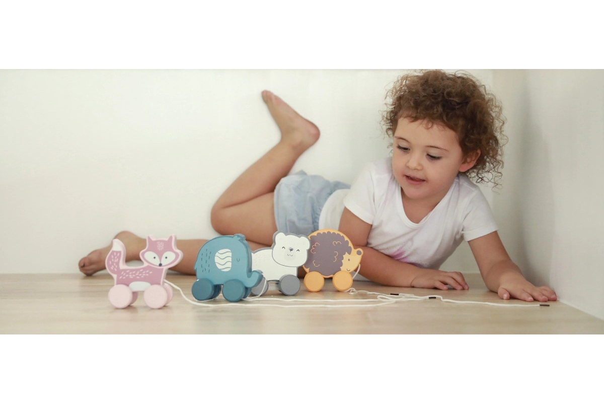 Žaislas turi virvelę patogiam traukimui, kas padeda gerinti vaikų motorinius įgūdžius.