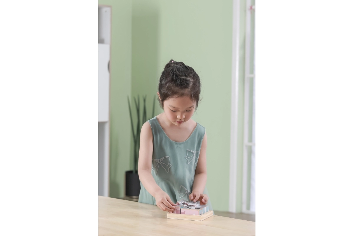 Žaidimas su kubeliais lavina smulkiąją motoriką, akių–rankų koordinaciją, kantrybę ir vizualinį suvokimą. Idealiai tinka pirmai loginei dėlionei.