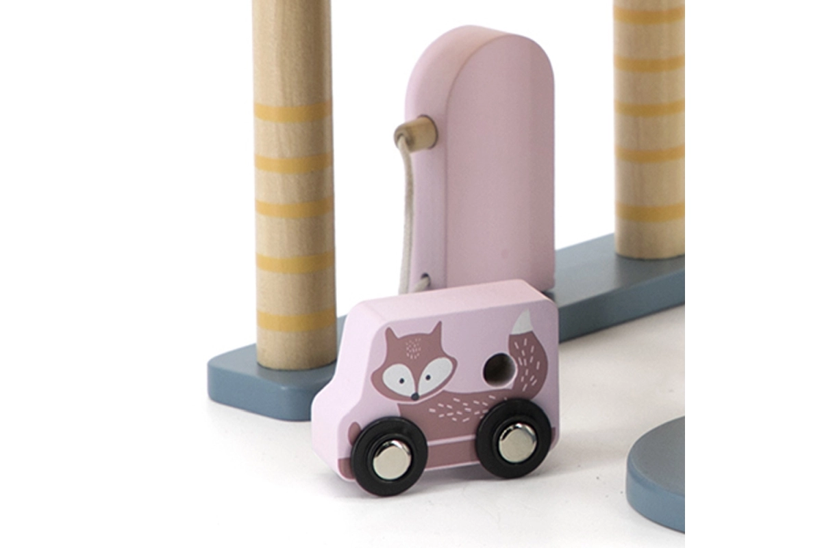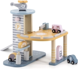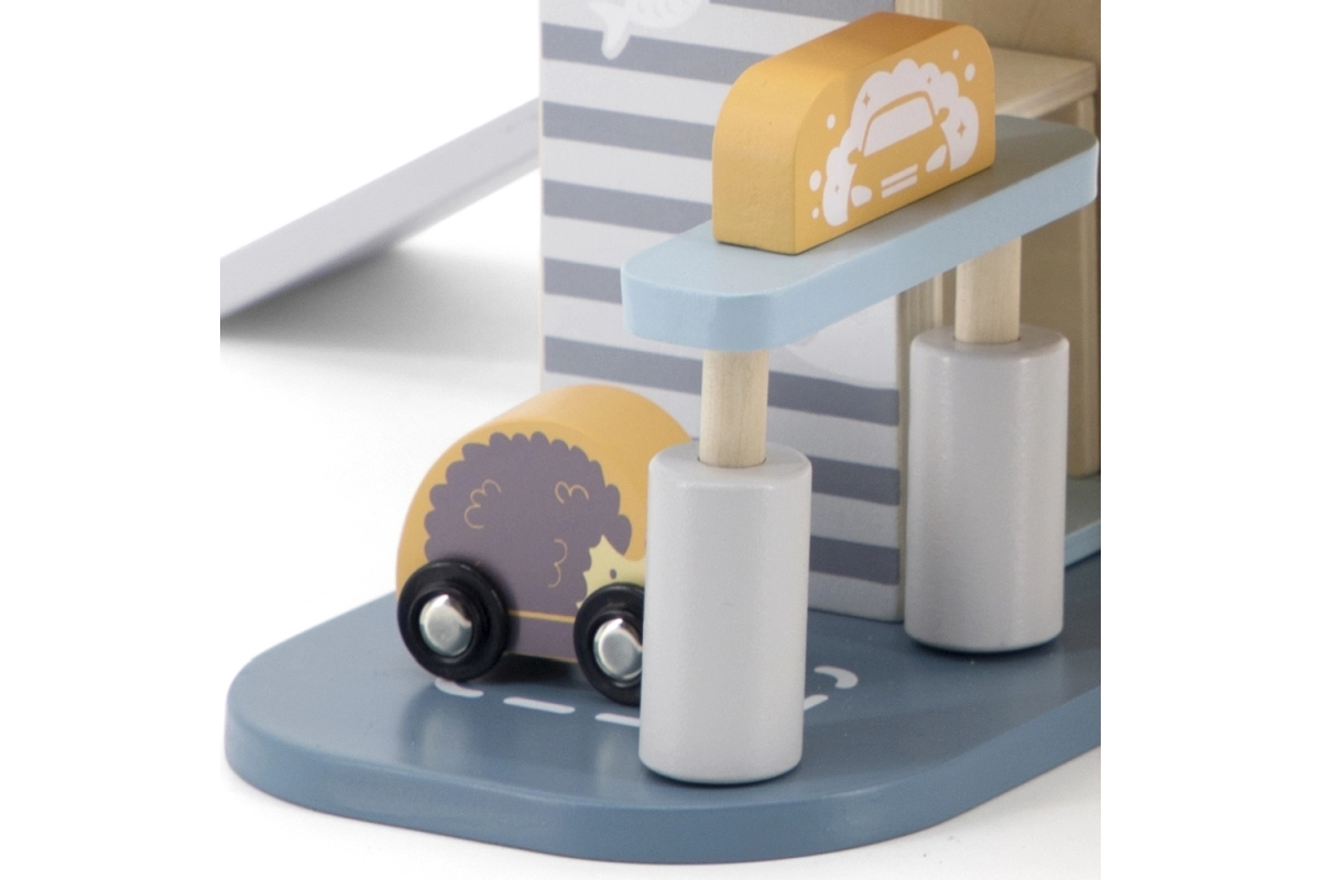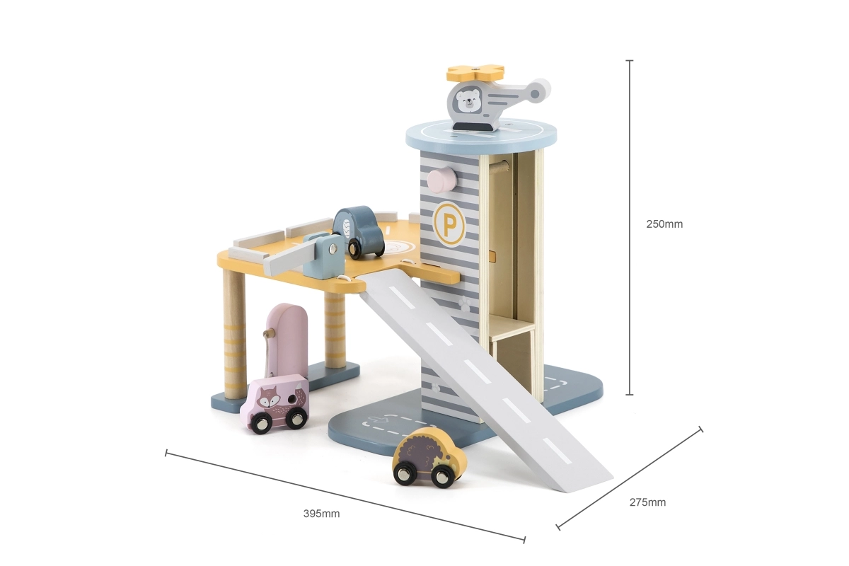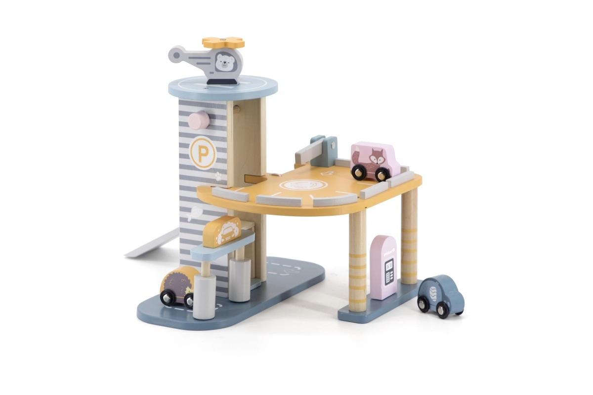Medinis garažas su sraigtasparniu ir mašinėlėmis – puikus žaislas, kuris skatina vaikų kūrybiškumą ir smulkiosios motorikos lavinimą. Šis interaktyvus žaislas aprūpintas automobilių plovykla, degaline ir liftu. Rinkinyje yra trys mašinėlės ir vienas sraigtasparnis, viskas prislopintų spalvų, tinkančių bet kuriam vaikų kambariui.