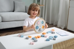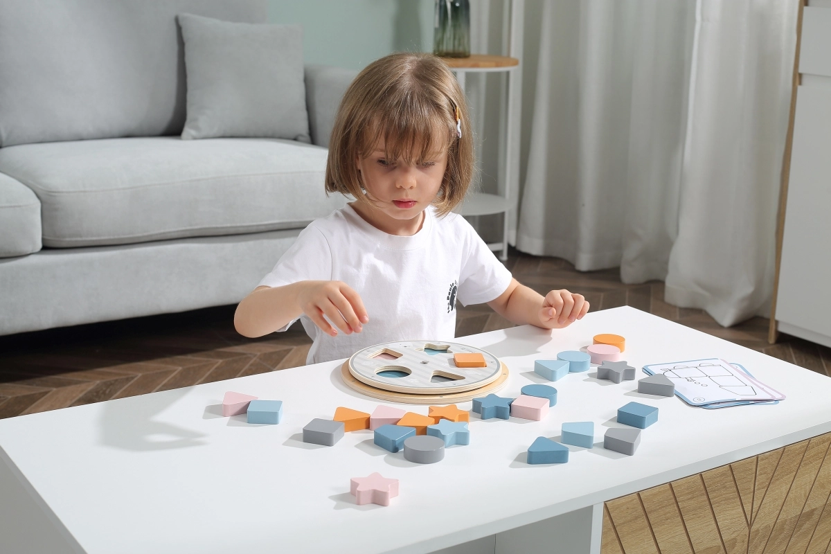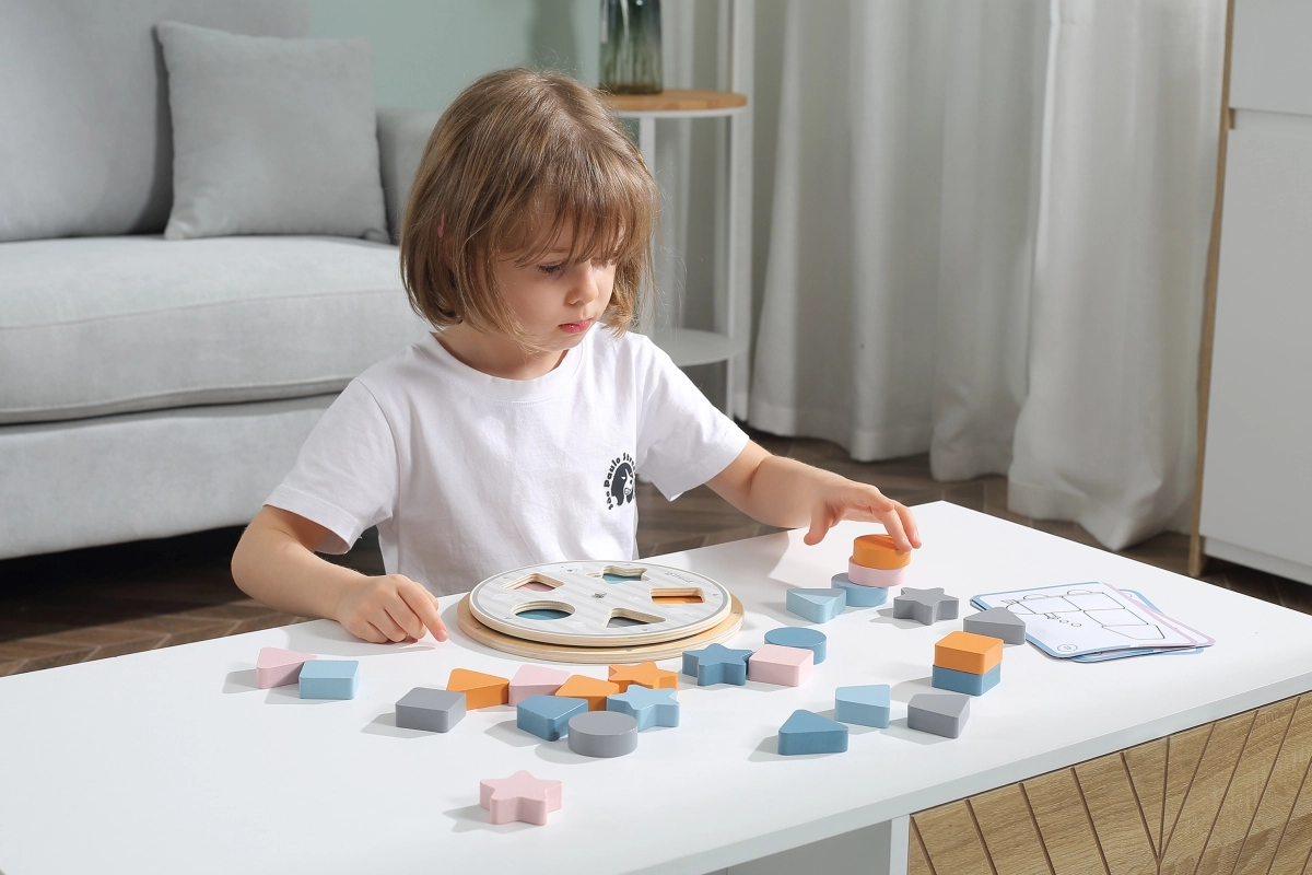 Vaikai pritaiko medinius elementus prie išpjovų lentoje ir natūraliai įsisavina spalvas bei pagrindines formas – ratą, kvadratą, trikampį ir žvaigždę.