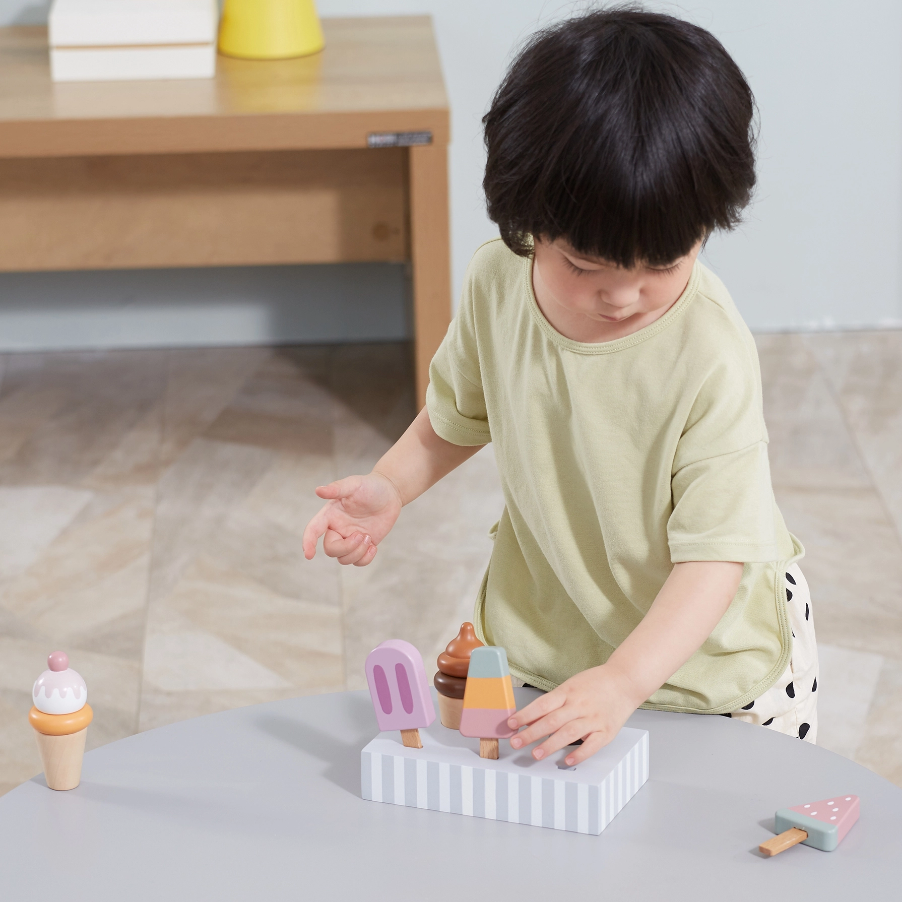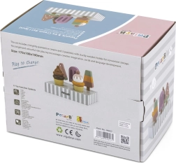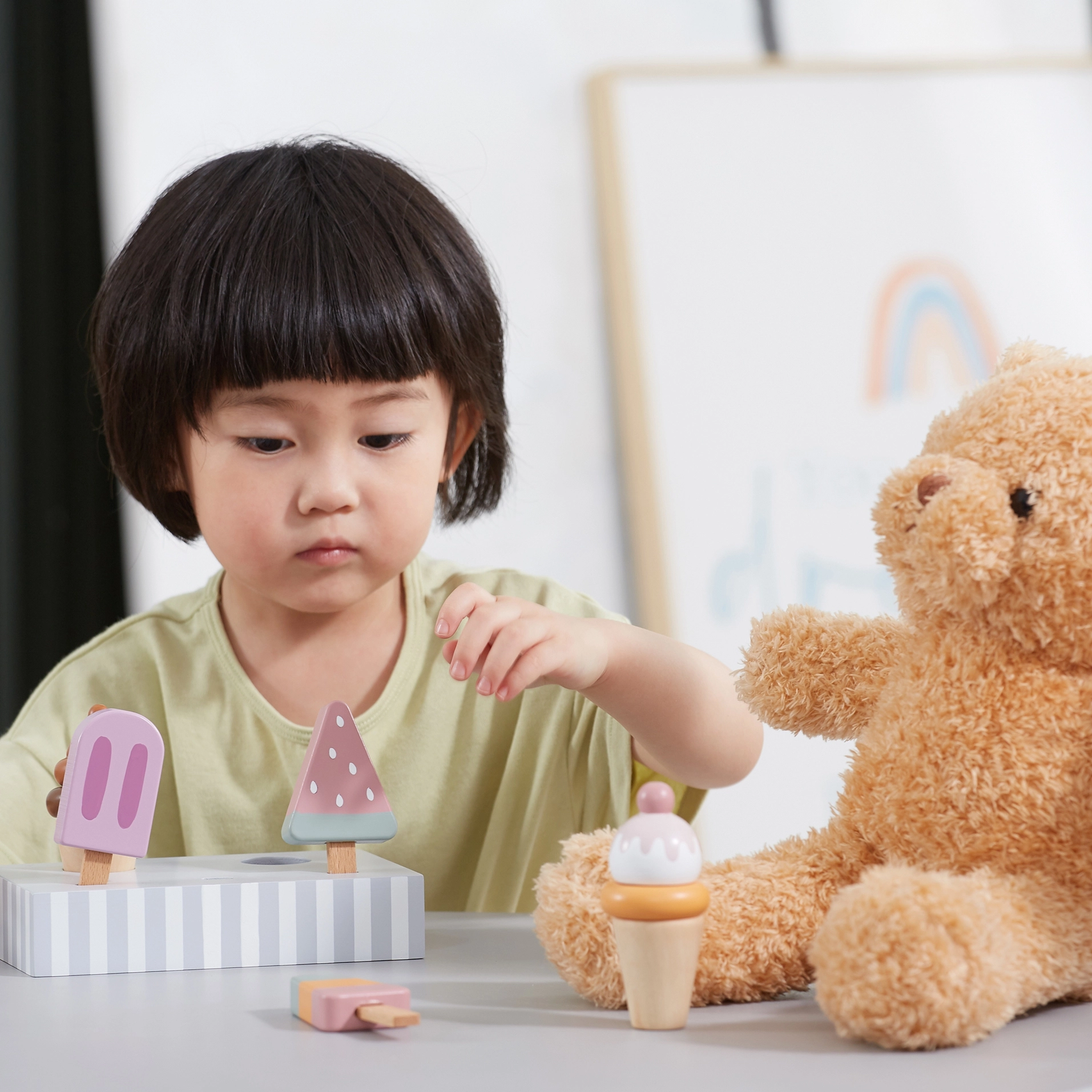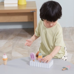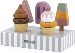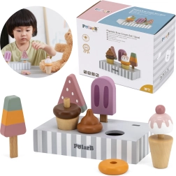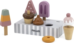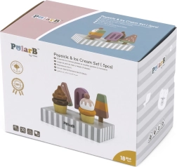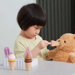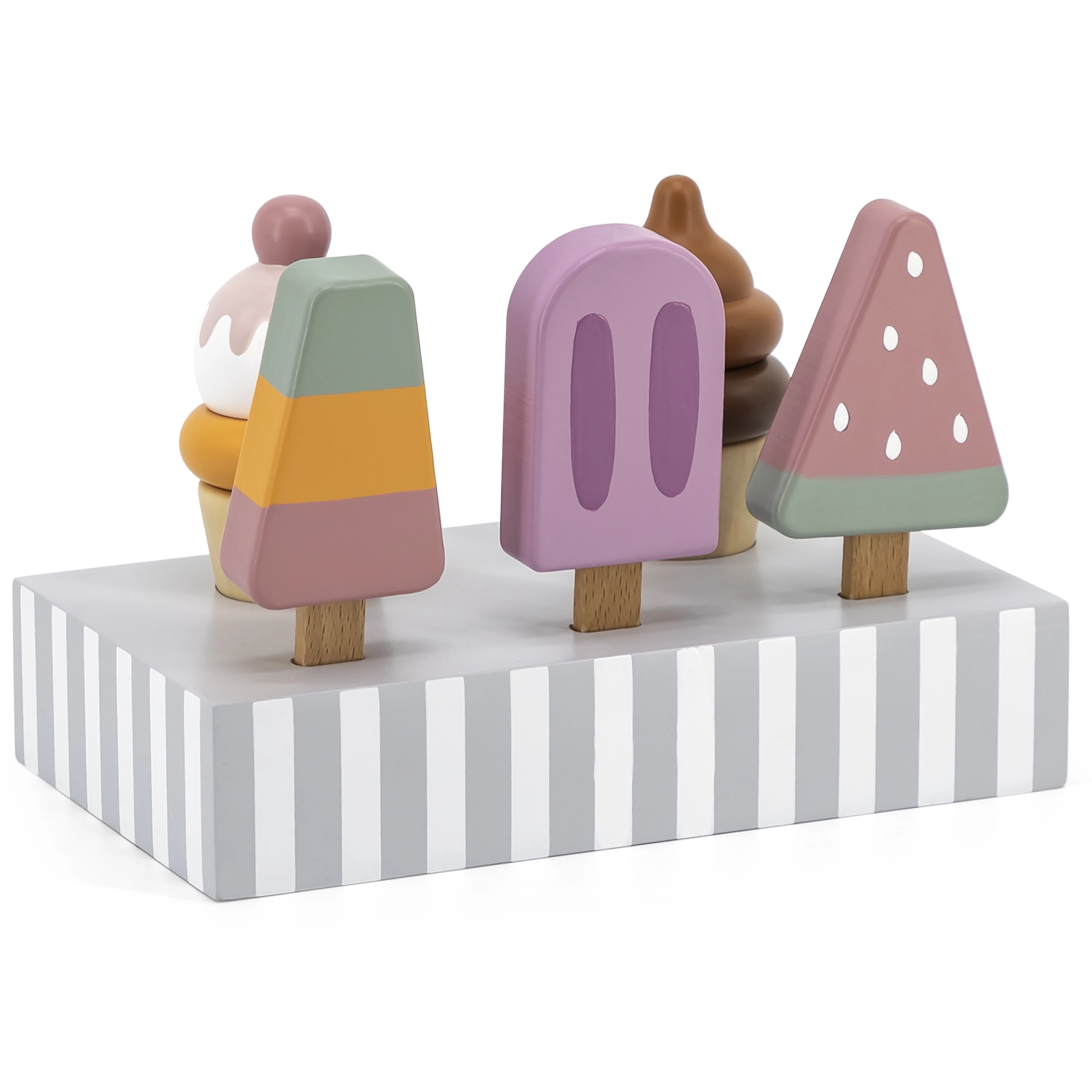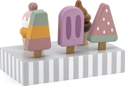 Rinkinys iš 5 medinių ledų viliojančiomis spalvomis suteikia vaikams begalę pramogų. Ledai sudėti ant stabilaus medinio stovelio, kuris tinka tiek eksponavimui, tiek tvarkingam laikymui. Viskas pagaminta iš kokybiškos medienos ir nudažyta saugiais, netoksiškais dažais.