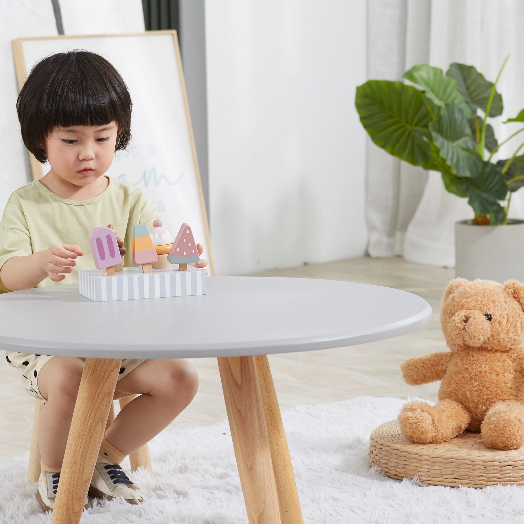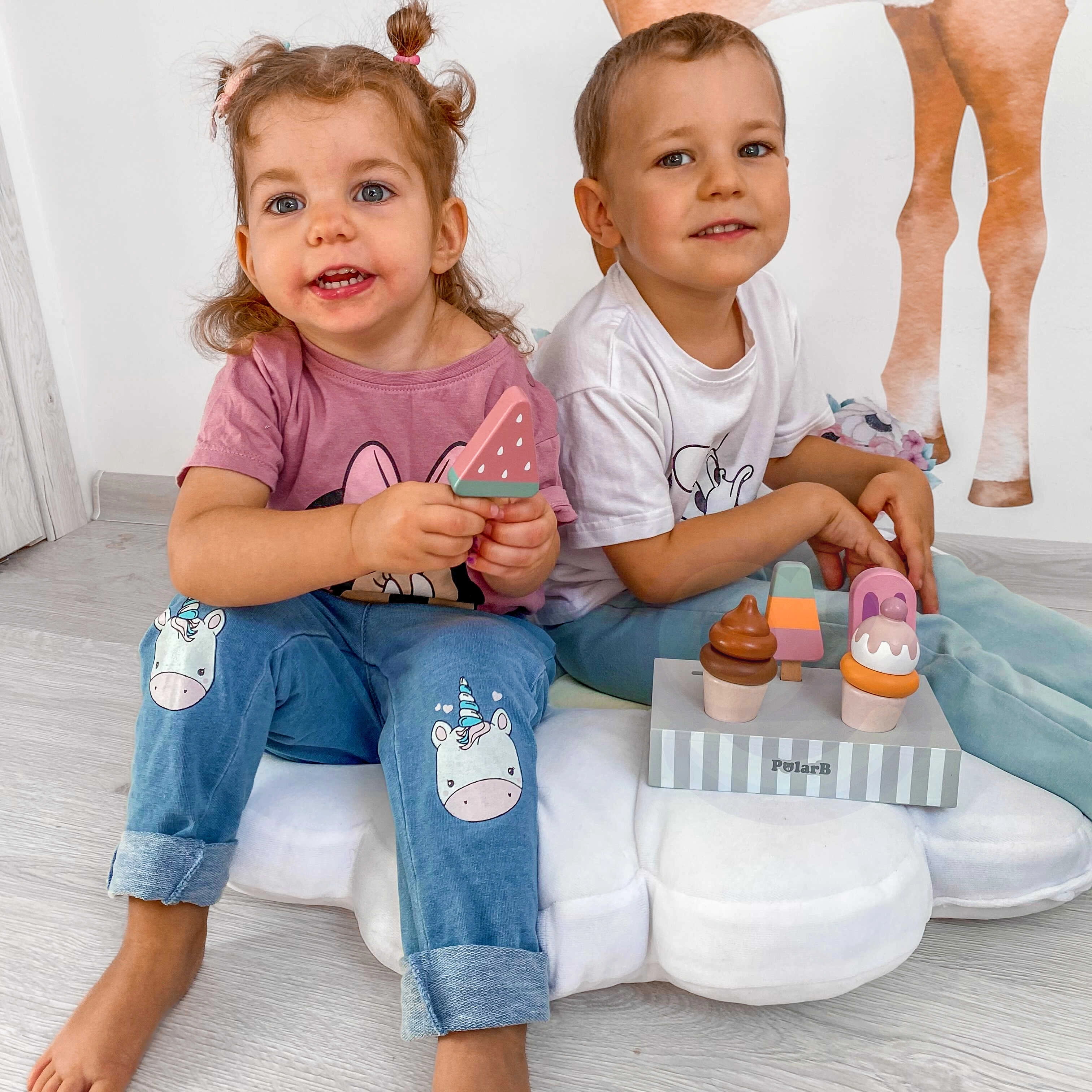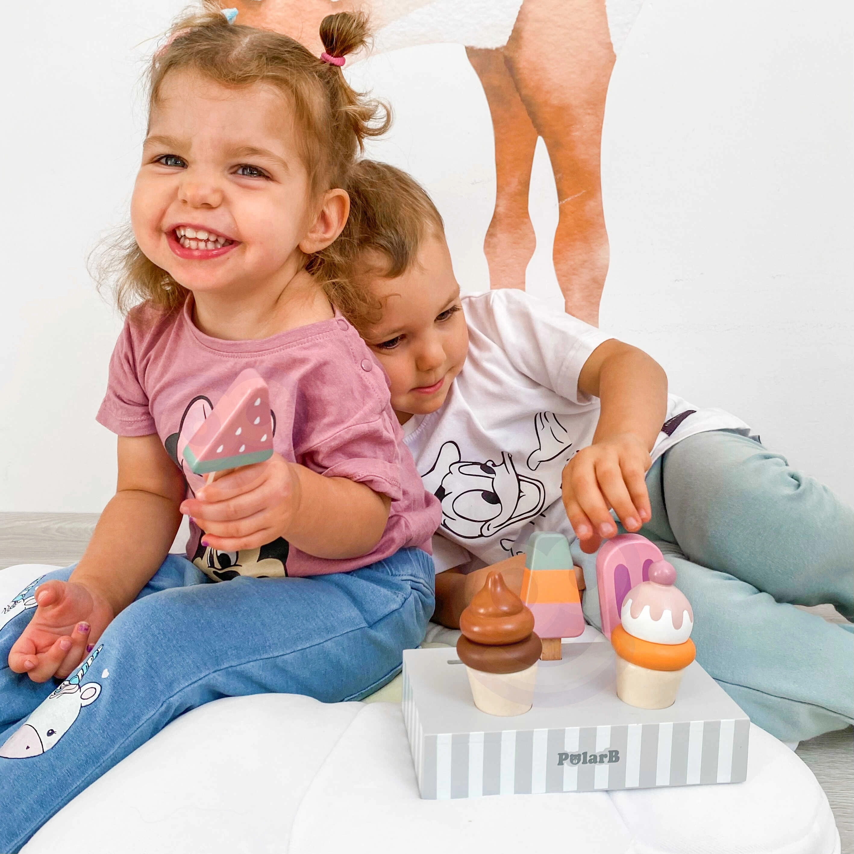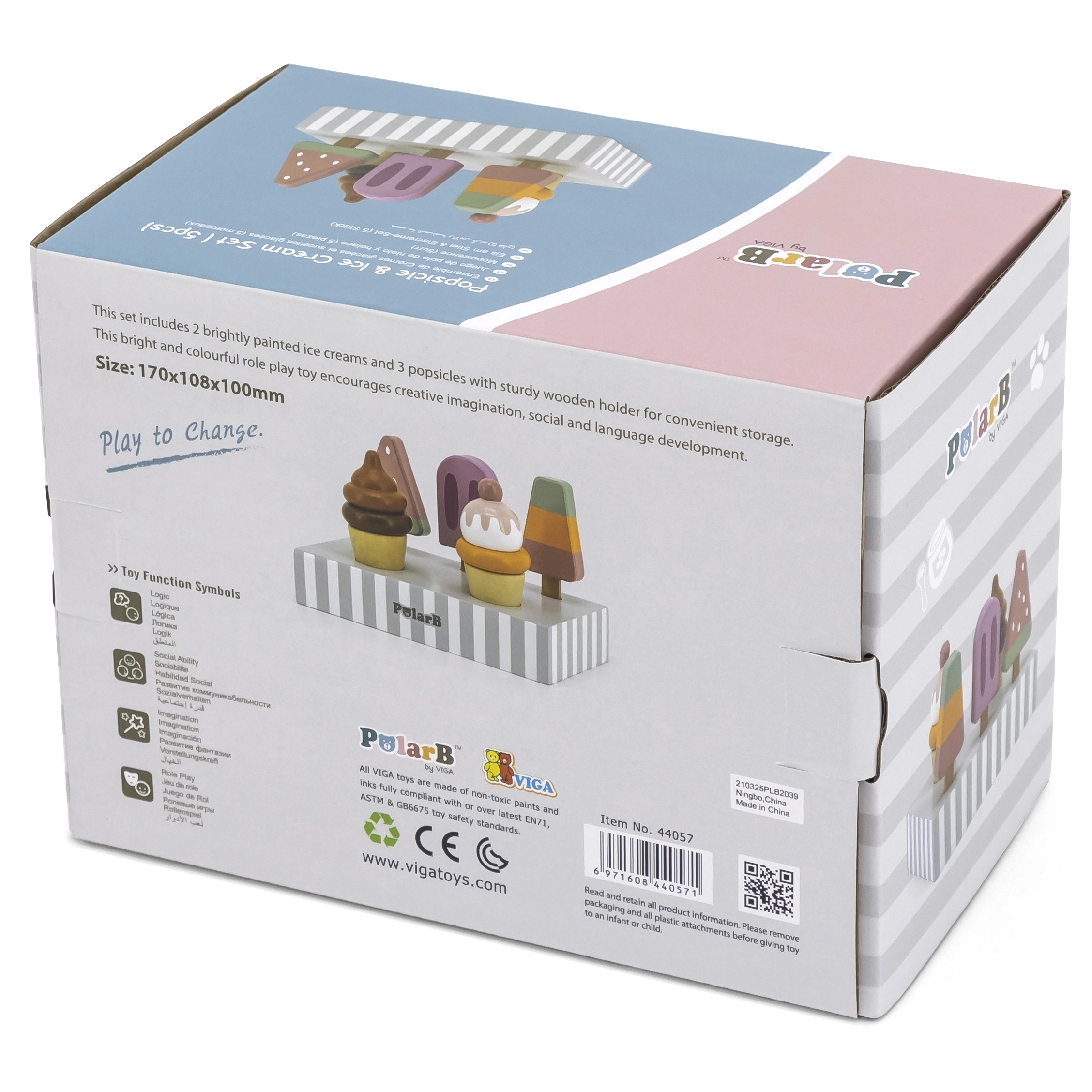Rinkinys iš 5 medinių ledų viliojančiomis spalvomis suteikia vaikams begalę pramogų. Ledai sudėti ant stabilaus medinio stovelio, kuris tinka tiek eksponavimui, tiek tvarkingam laikymui. Viskas pagaminta iš kokybiškos medienos ir nudažyta saugiais, netoksiškais dažais.