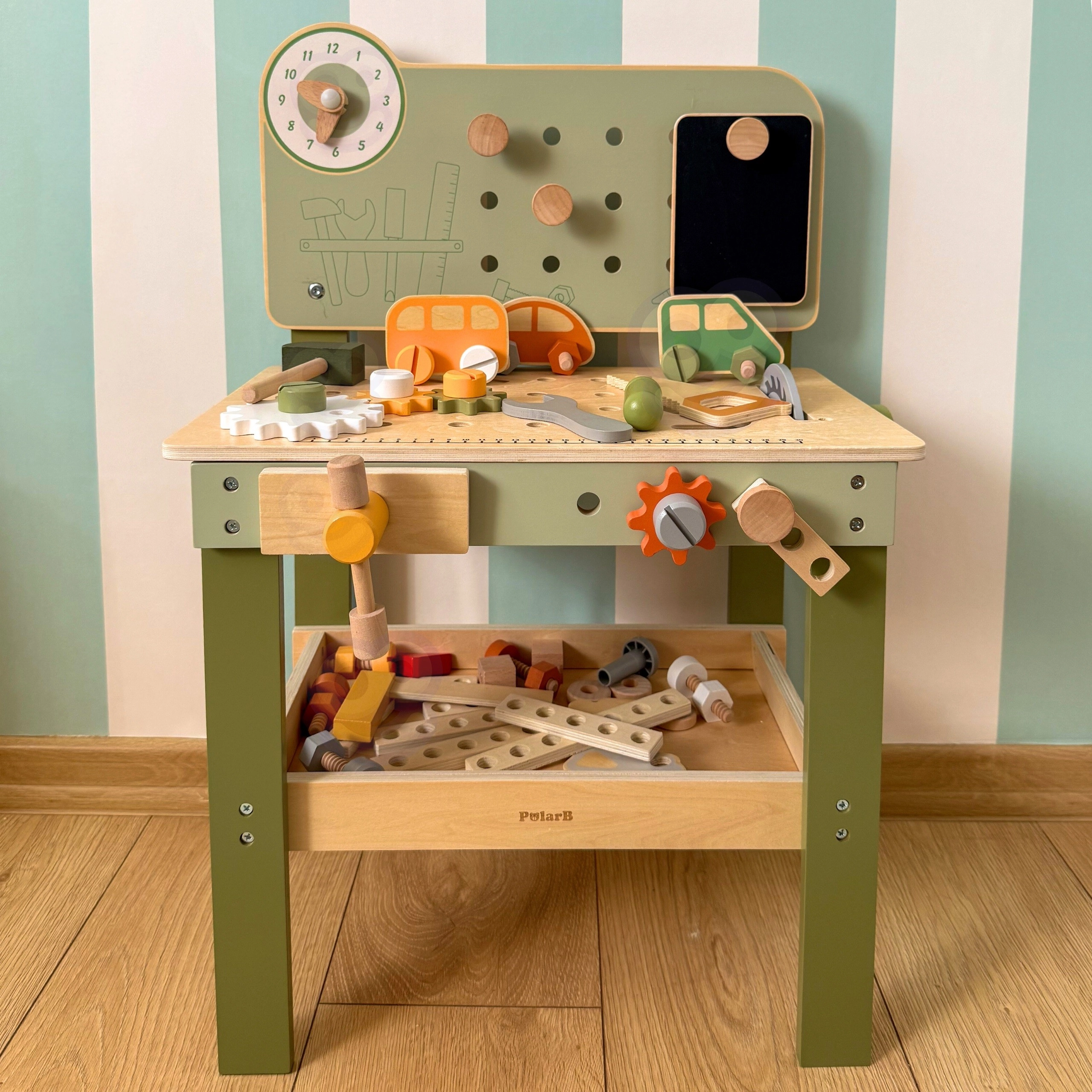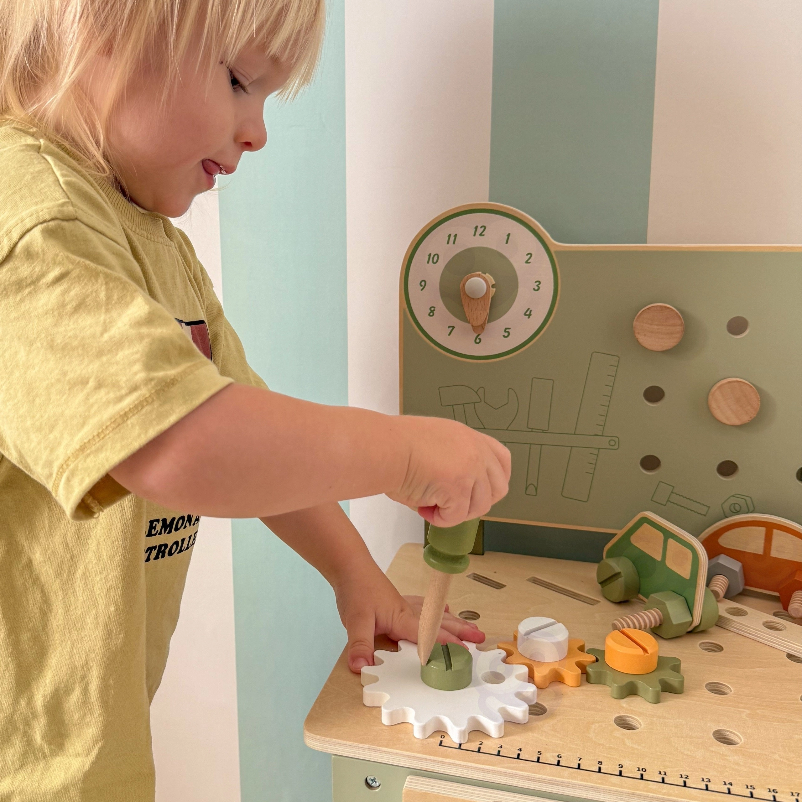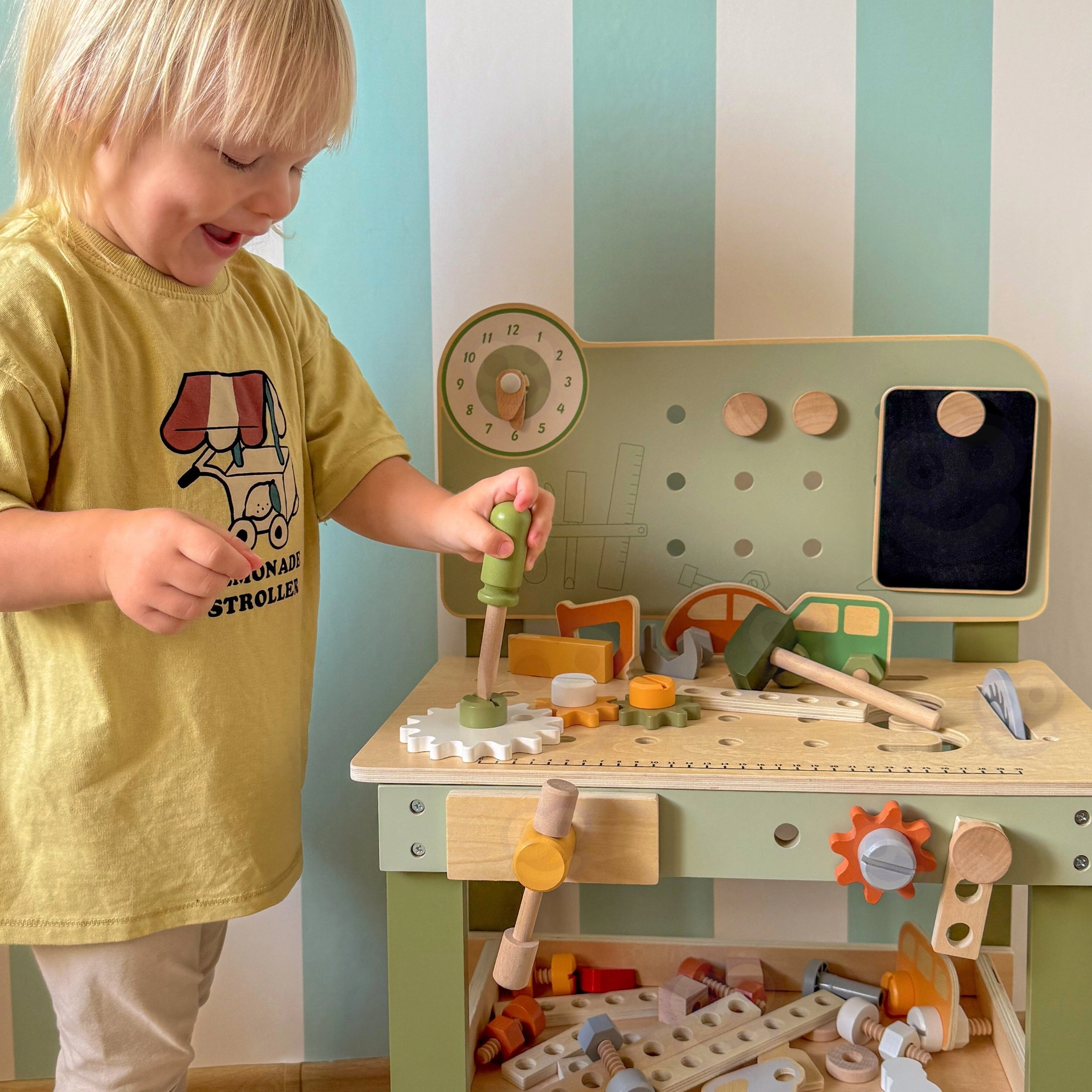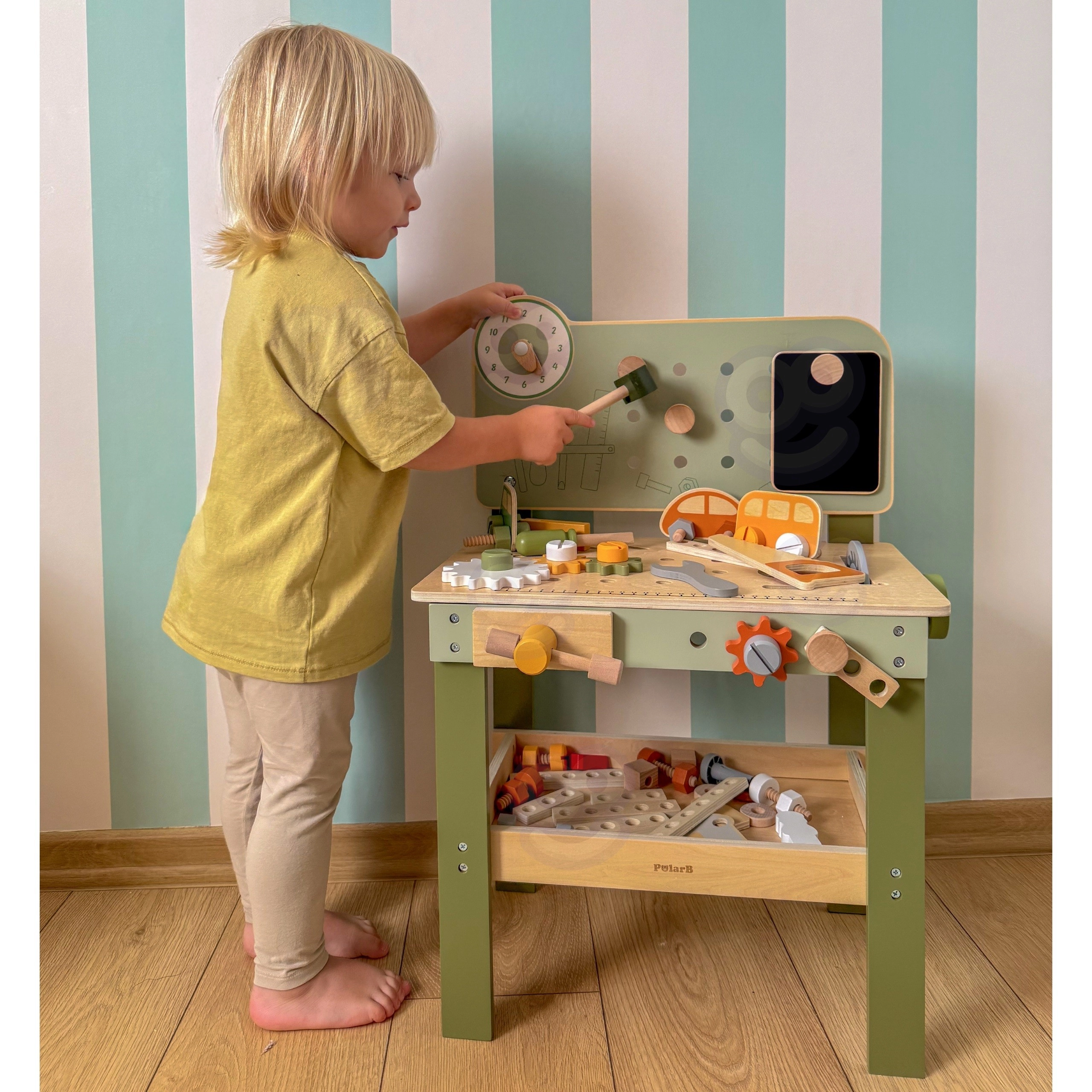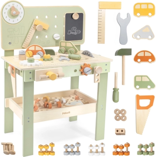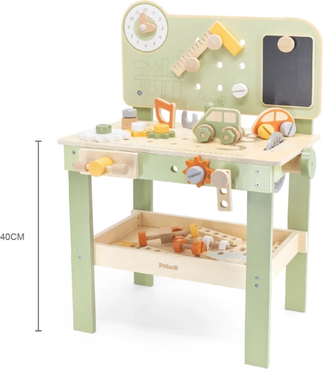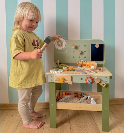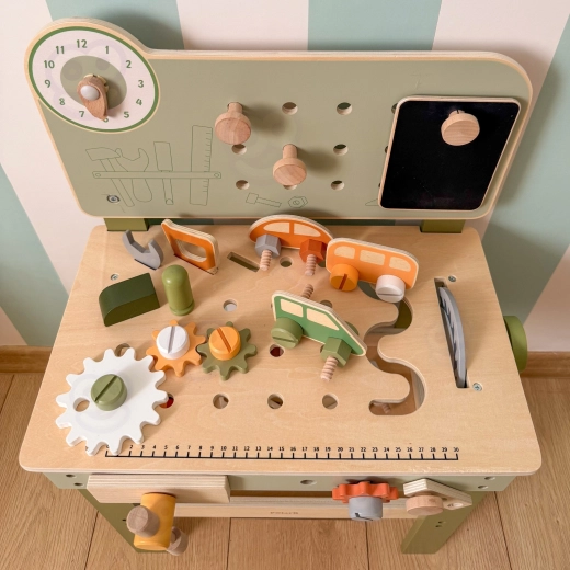 Komplekte yra įrankių rinkinys (plaktukas, raktas, atsuktuvas), varžtai, veržlės, krumpliaračiai, skydelis su mokomuoju laikrodžiu ir praktiška lentynėlė daiktams pasidėti. Vaikai gali konstruoti savo kūrinius, „taisytis“ ir rūšiuoti detales – idealiai tinka kūrybiškumui, kantrybei ir planavimui ugdyti.