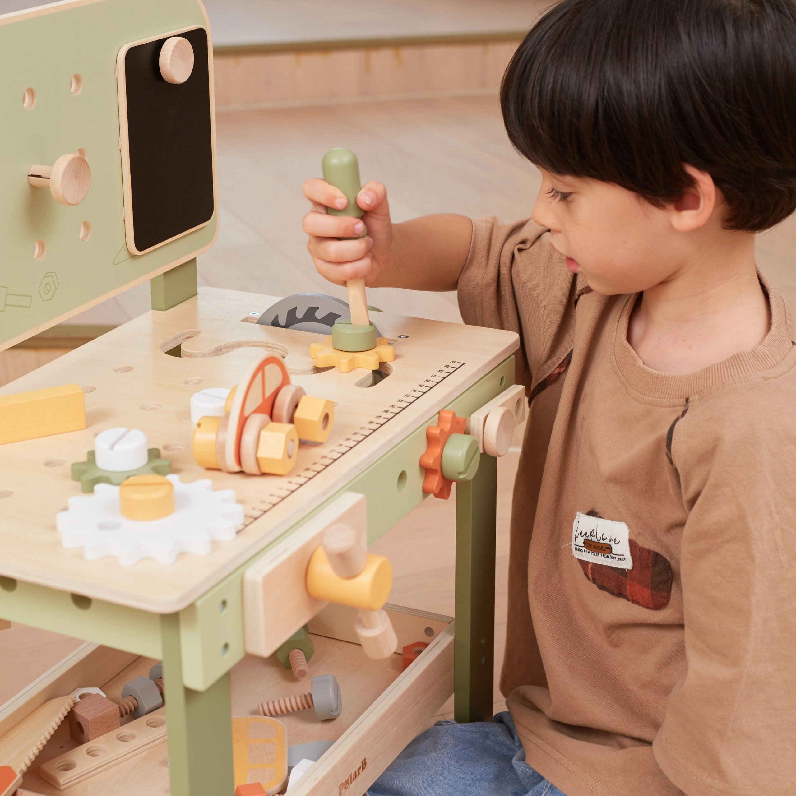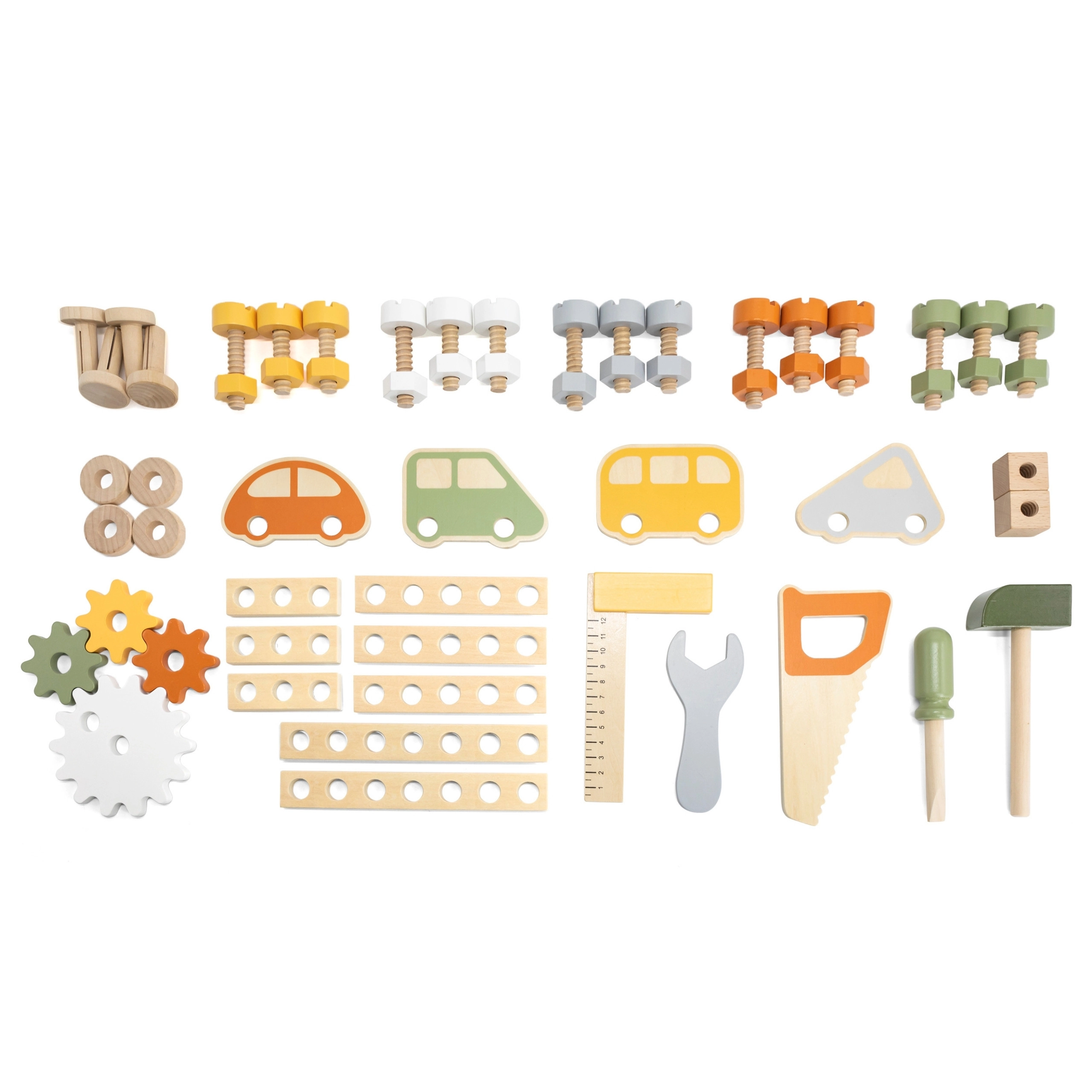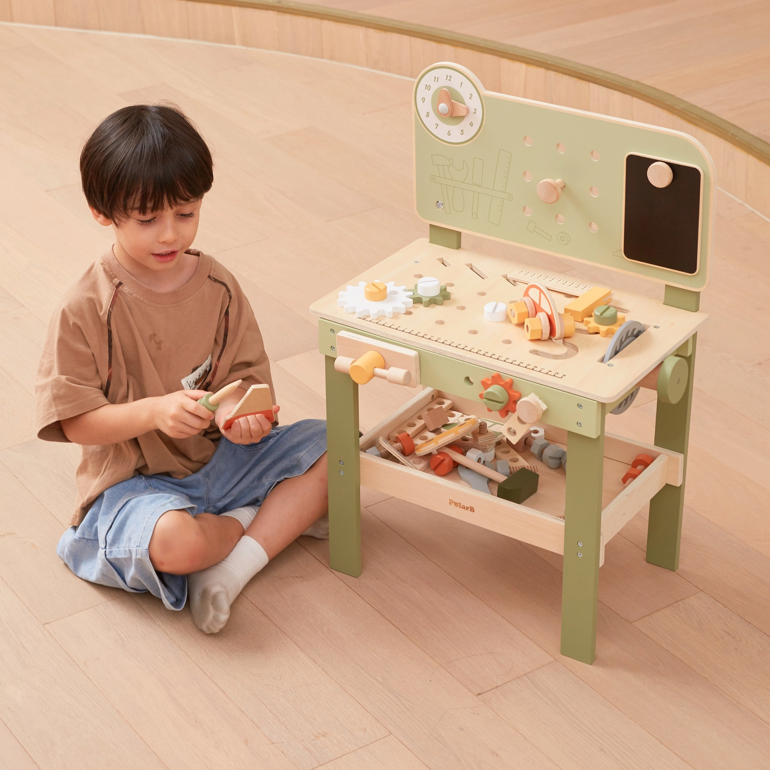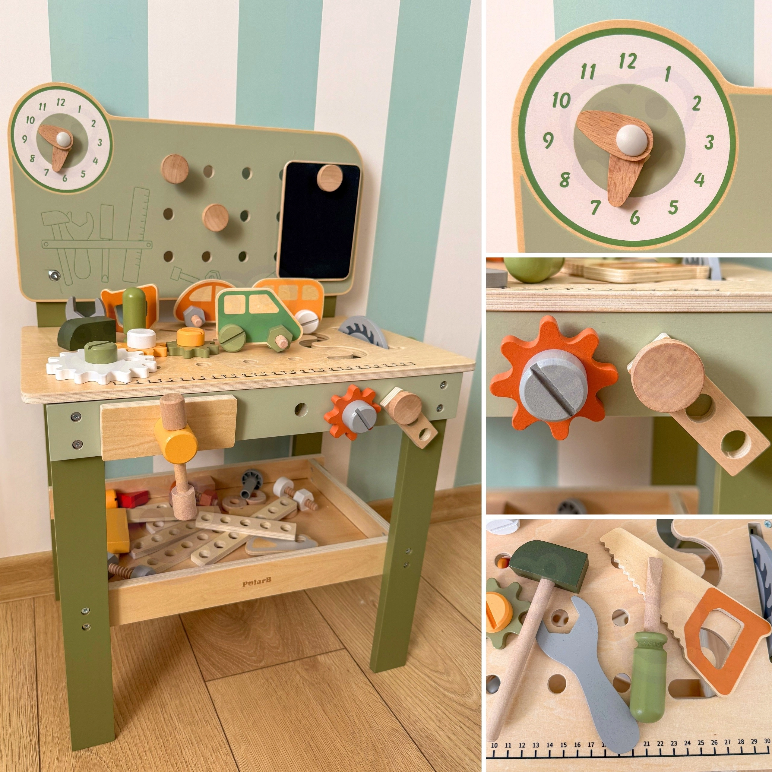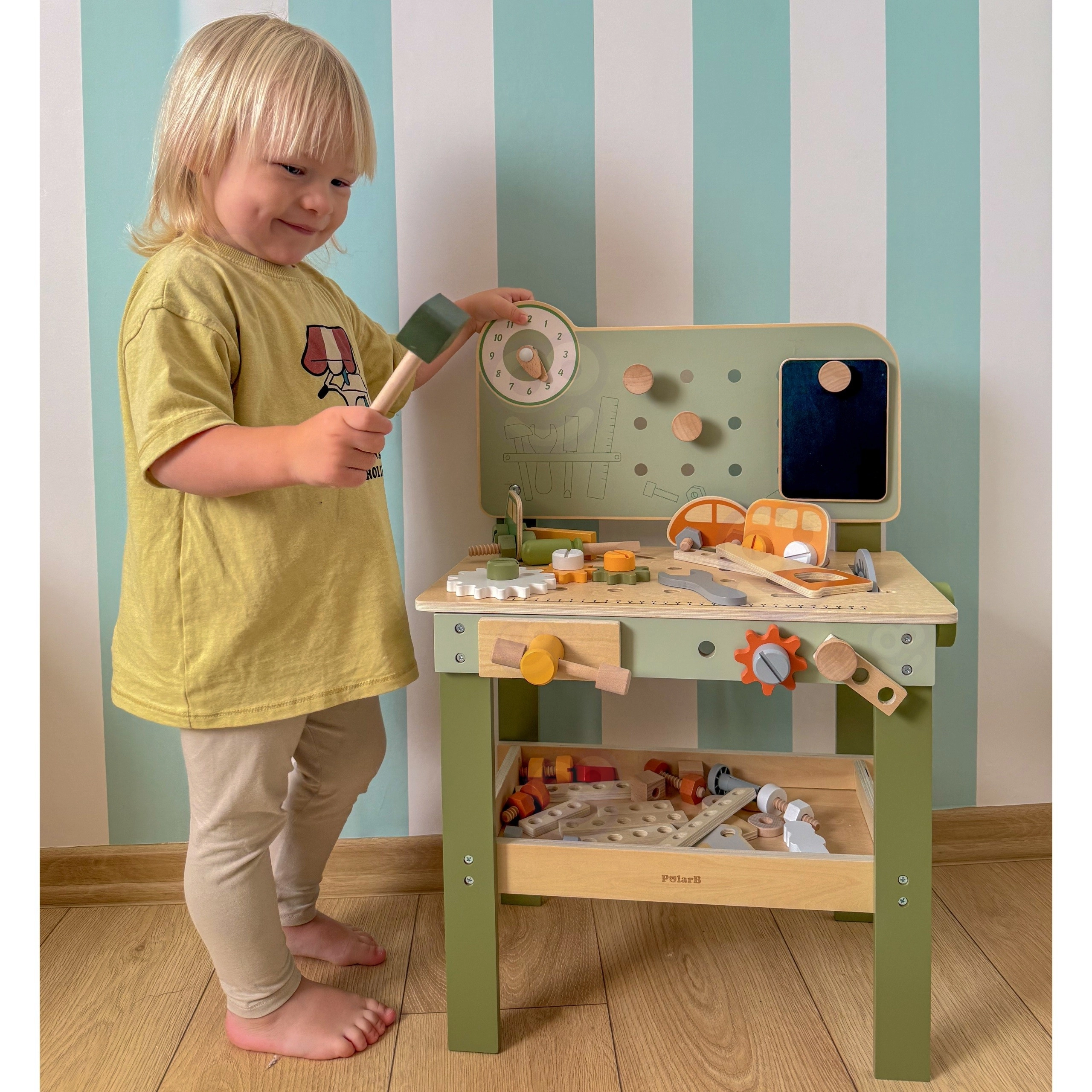 Komplekte yra įrankių rinkinys (plaktukas, raktas, atsuktuvas), varžtai, veržlės, krumpliaračiai, skydelis su mokomuoju laikrodžiu ir praktiška lentynėlė daiktams pasidėti. Vaikai gali konstruoti savo kūrinius, „taisytis“ ir rūšiuoti detales – idealiai tinka kūrybiškumui, kantrybei ir planavimui ugdyti.